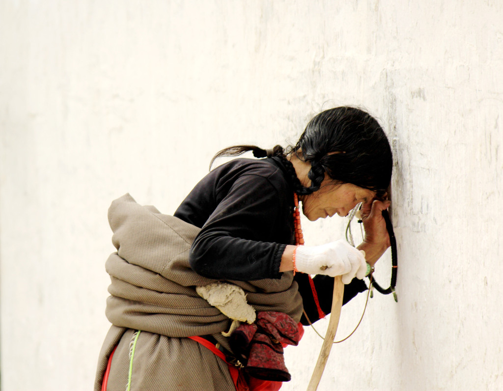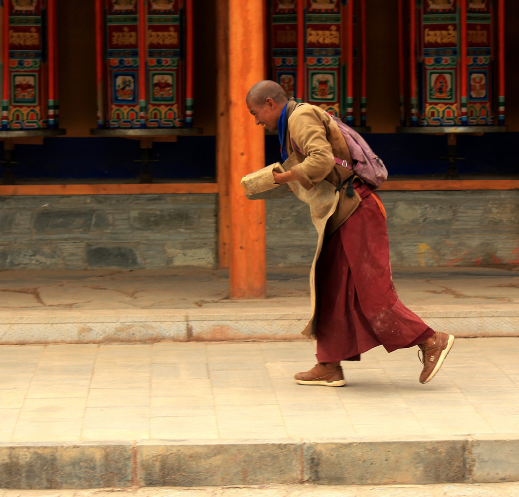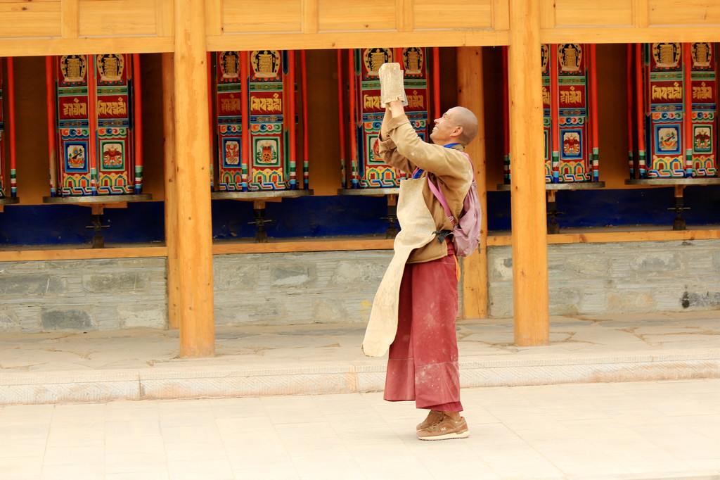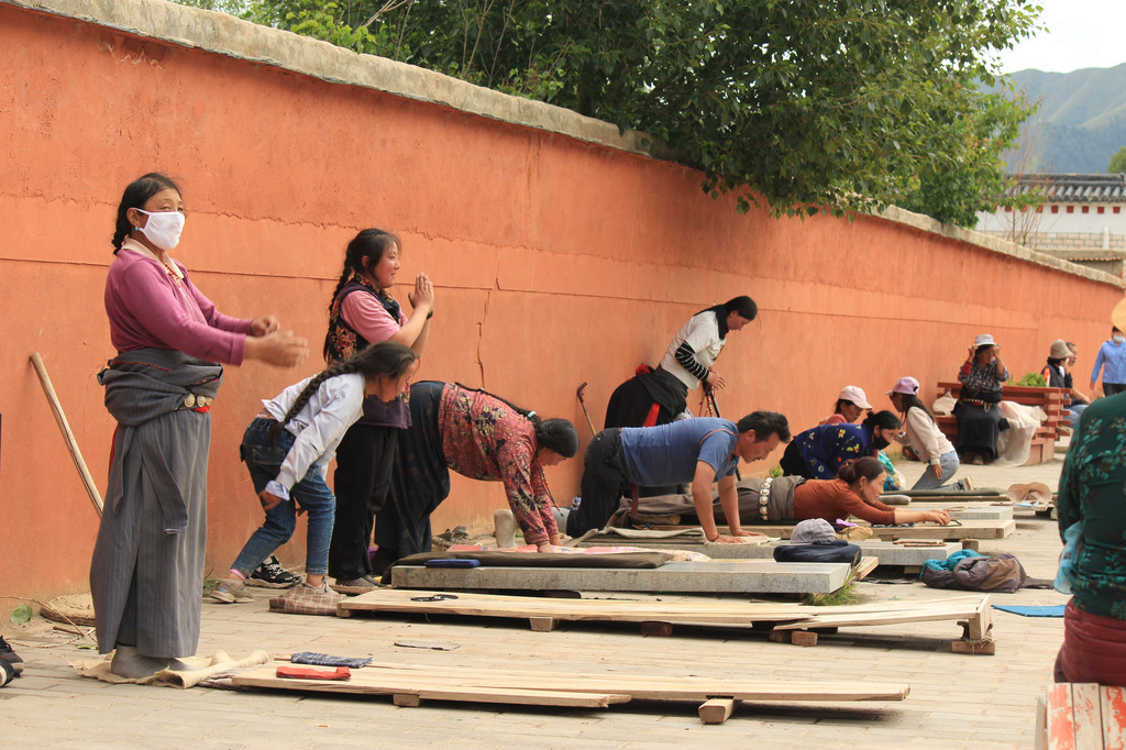 最虔诚的朝拜者是五体投地的信徒!他(她)们一拜一叩,用身体丈量着自己对信仰的诚心!我在拉卜楞寺看到了数个这样的朝拜者。信仰的力量是无穷的!在众多的朝拜者中,我看到不少白发苍苍、佝偻着身体、手拿佛珠,拄着拐杖的老夫老妇,他们步履珊珊地行走在朝拜的路上,只为那心中的信仰……