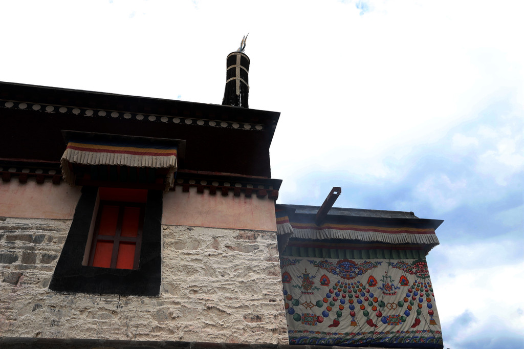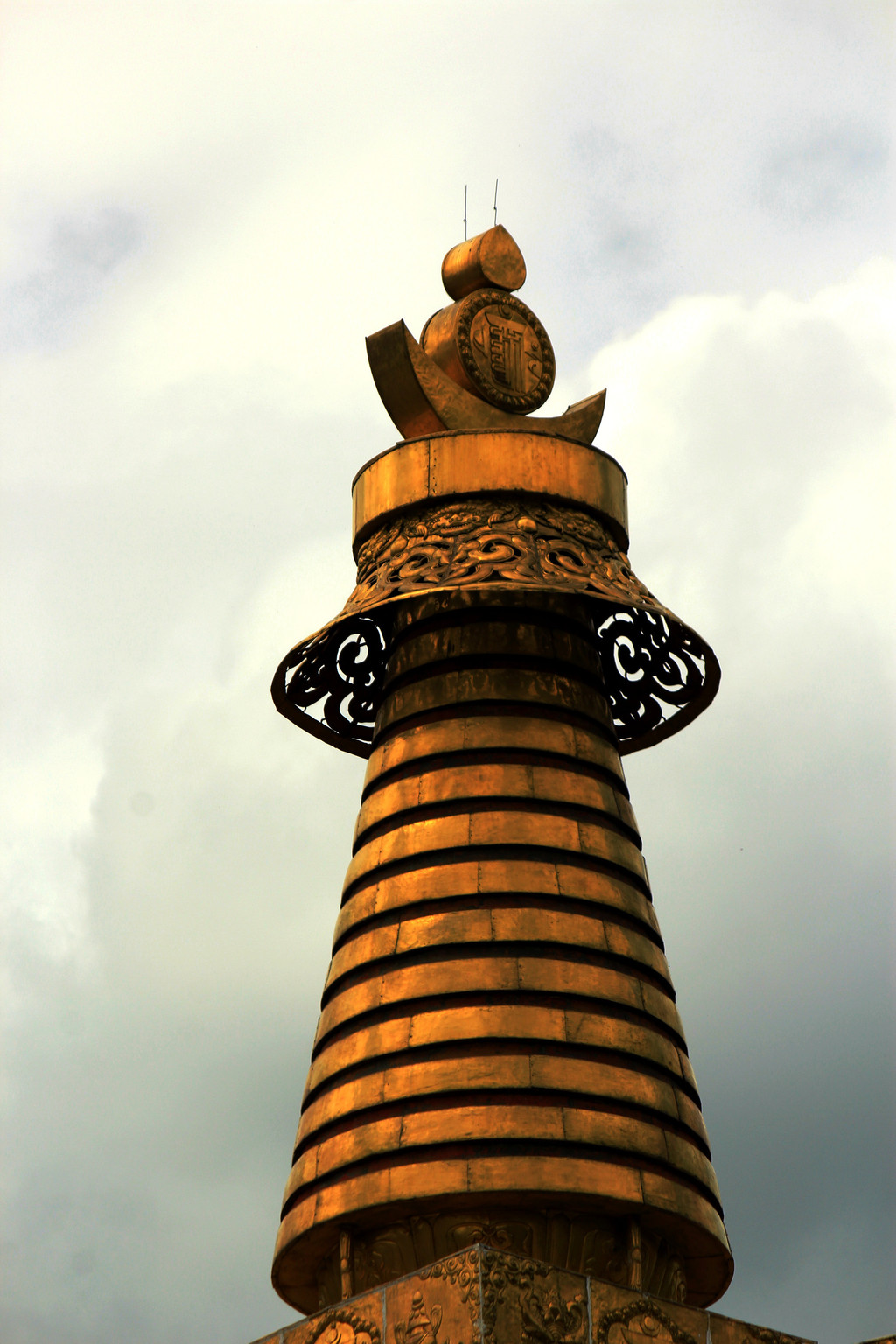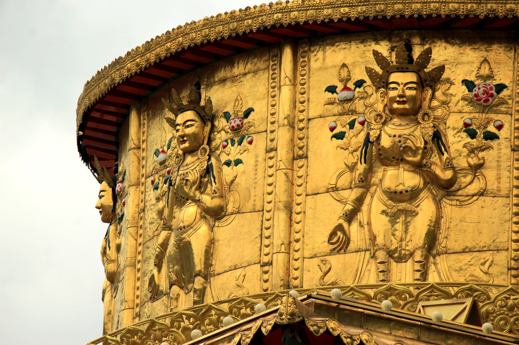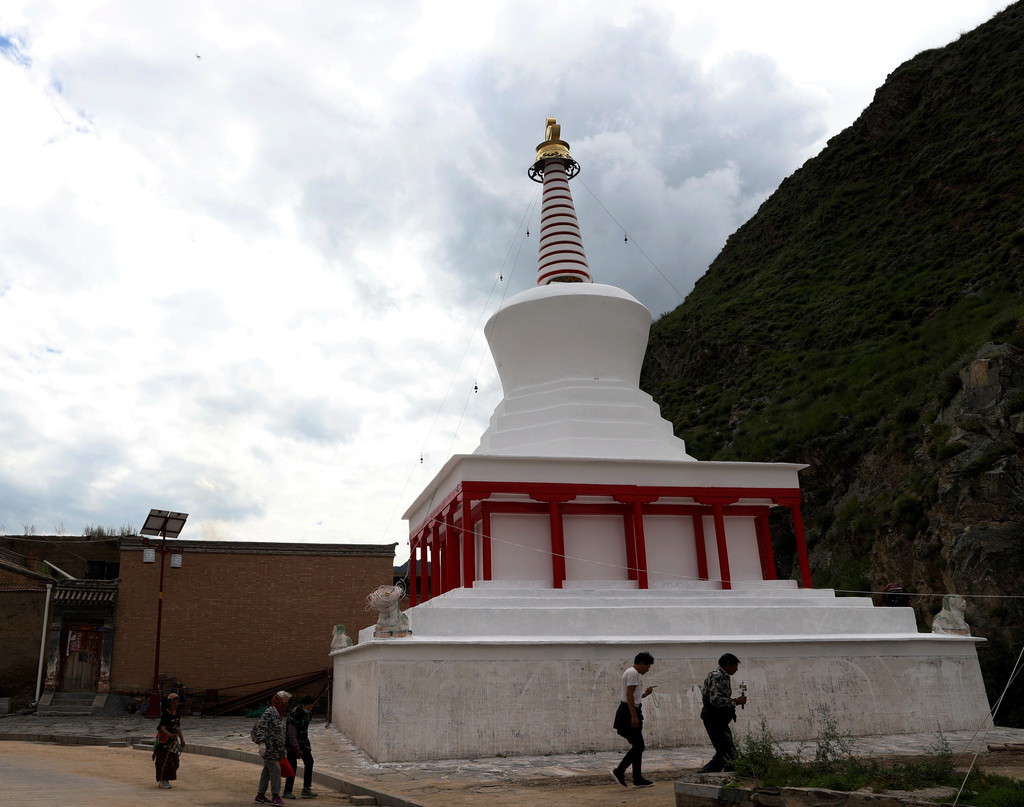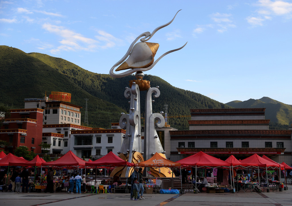 拉卜楞寺里的贡唐宝塔,是拉卜楞寺的地标性建筑,宝塔呈金黄色,在阳光下非常漂亮耀眼。塔内供奉着佛像,塔尖和底座金碧辉煌,是拉卜楞寺寺院群里最耀眼的建筑之一。进塔身沿着楼梯上到顶部的开放平台,可以观看拉卜楞寺的全景,是拍摄拉卜楞寺的好地方。周边的商铺在售卖各种纪念品,但由于疫情的影响,游客不多,生意肯定也不会好。