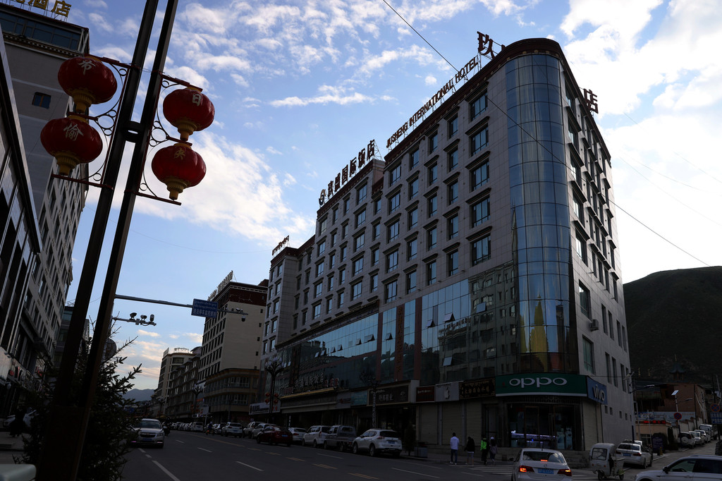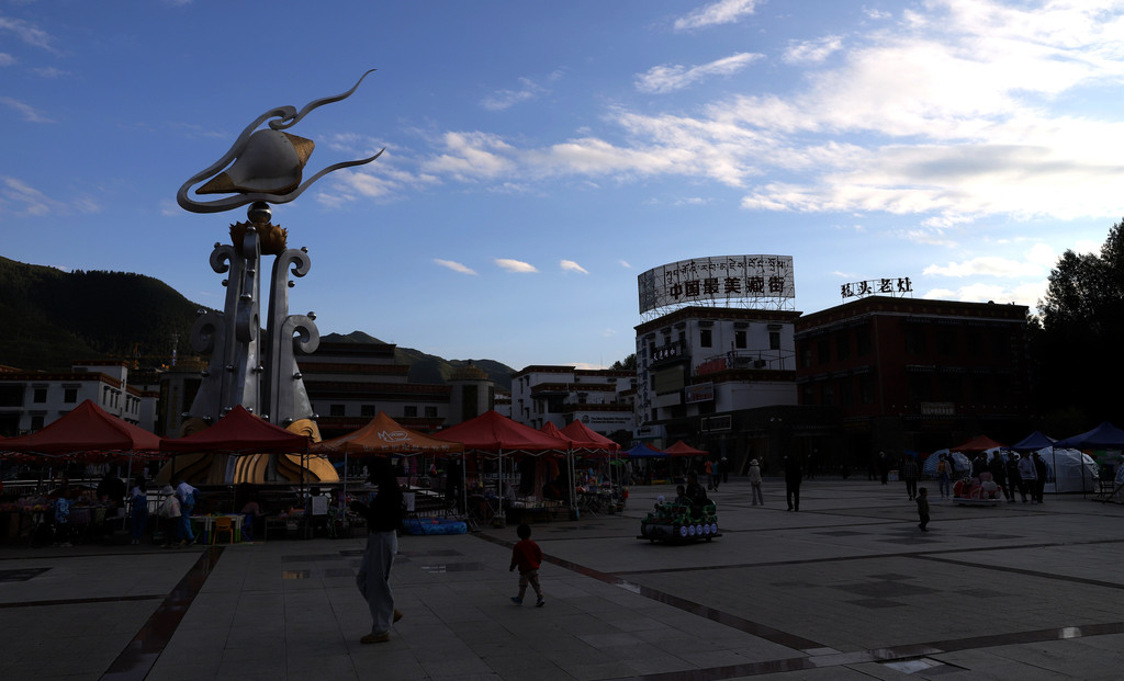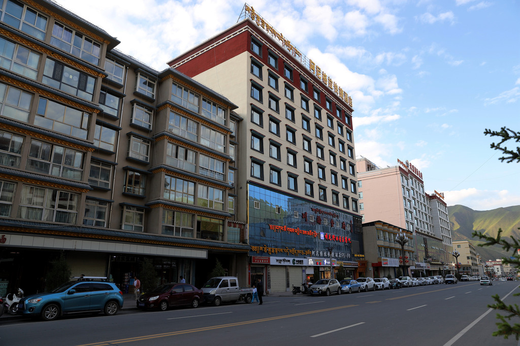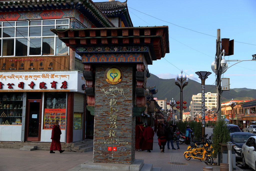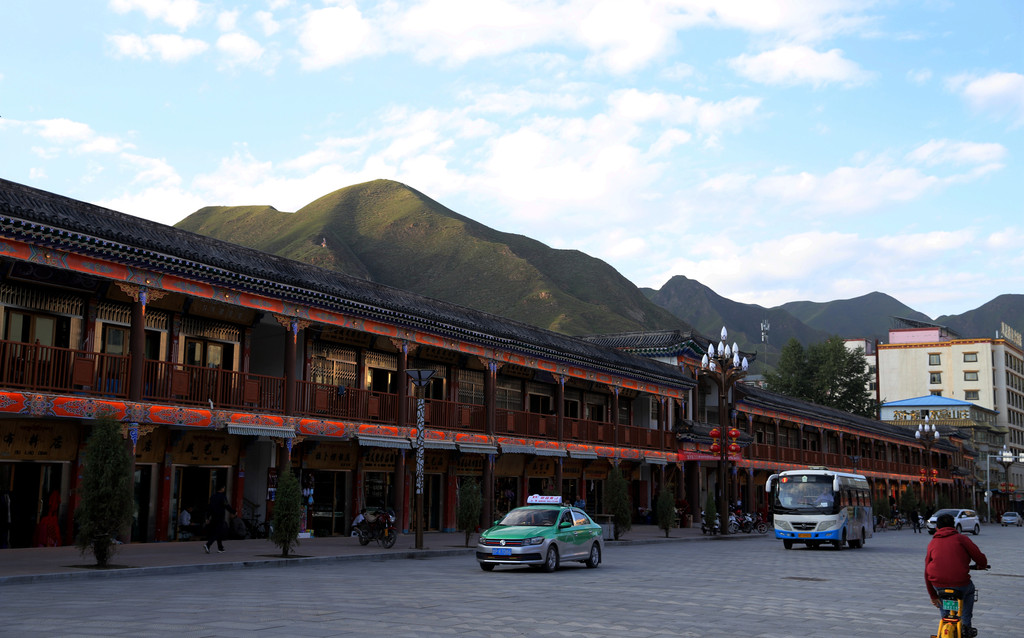 从拉卜楞寺返回宾馆的途中,经过县城的大街,夏河县虽然是个高原县,人口不多,但是由于旅游业发达,建筑还是很有气派的,街道也很宽敞,商店林立,有数个星级宾馆,楼房也很高。还有一条特色街道,楼房顶部的大广告牌上写着“中国最美藏街”几个大字。