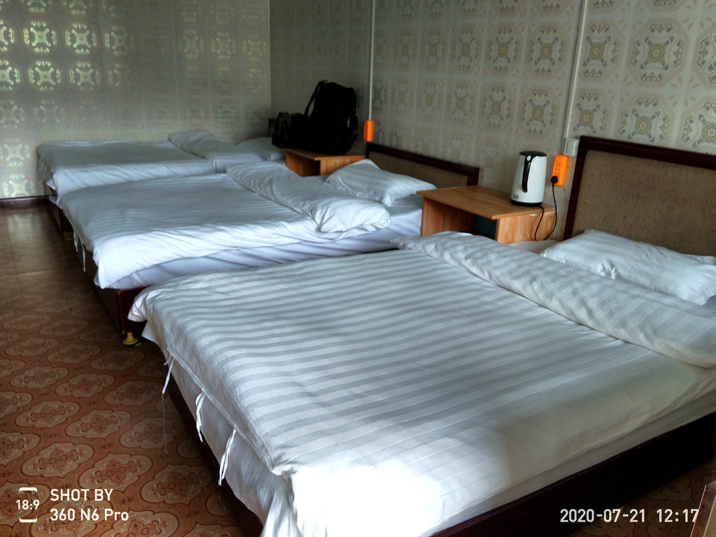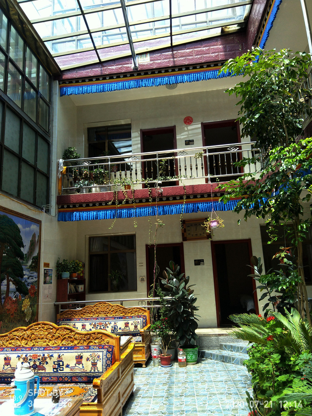 下车以后,与宾馆老板电话联系(事先在携程网上订的宾馆),在他的指点下,很快到达宾馆。这是一个藏族风格的宾馆,布置的很雅致,房间也给我升了级,从6人间升级到3人间,房间很大,只住了我一个人,很是满意。住下后去吃午饭,为了犒劳一下自己,点了两个菜,谁知菜的分量很足,一顿没吃完,为了不浪费,只有打包带走,留着晚上吃。吃罢午饭以后就前往拉卜楞寺。