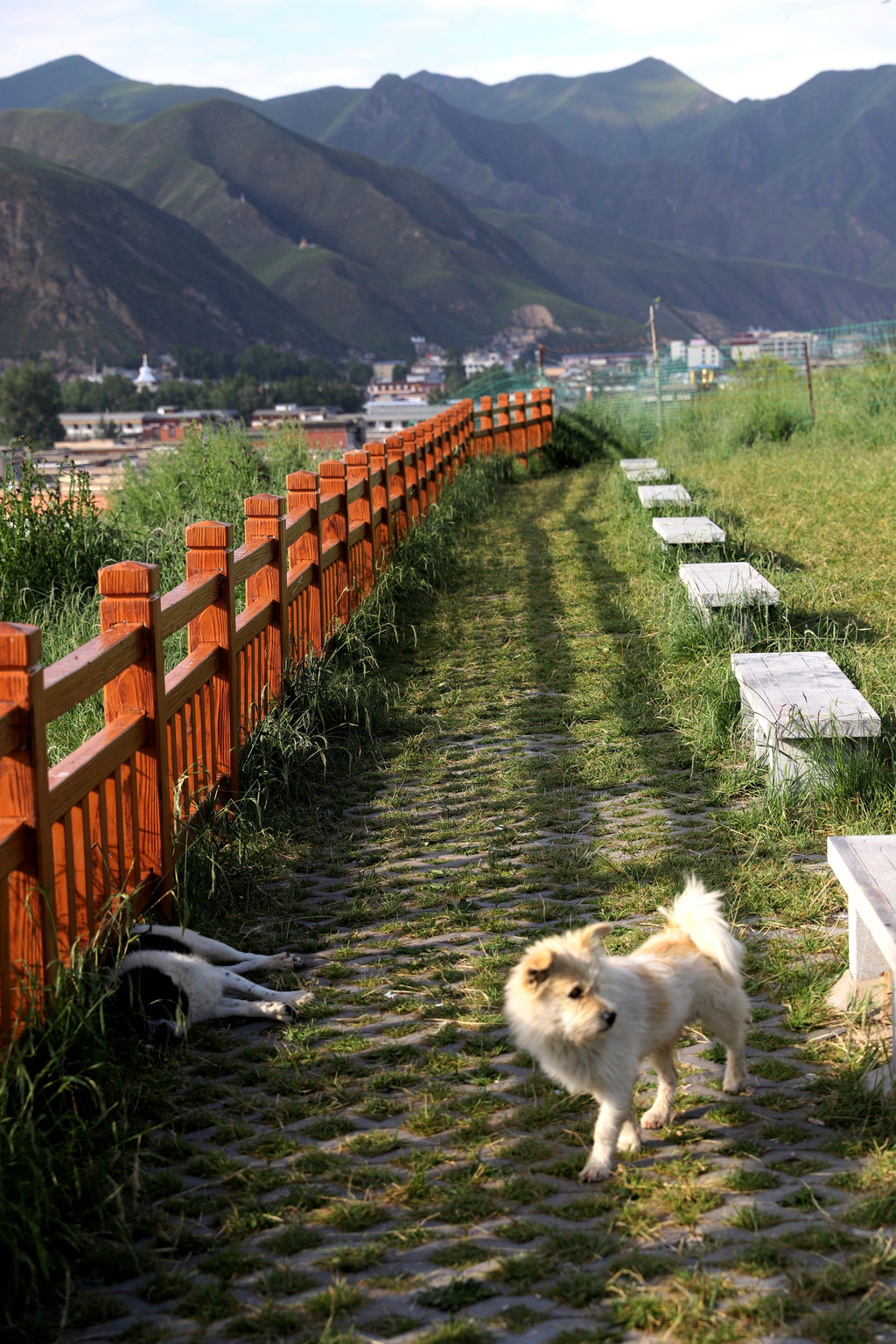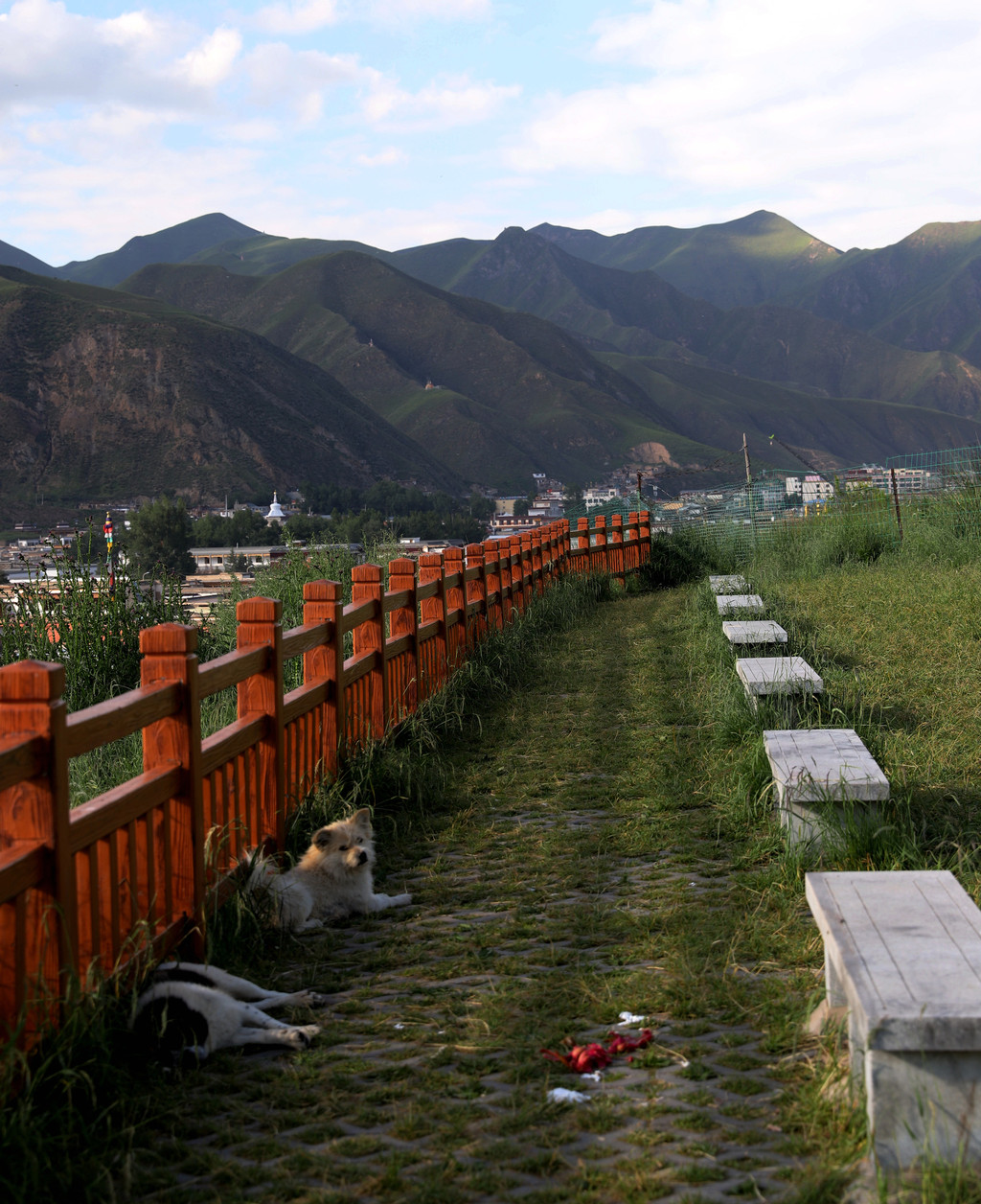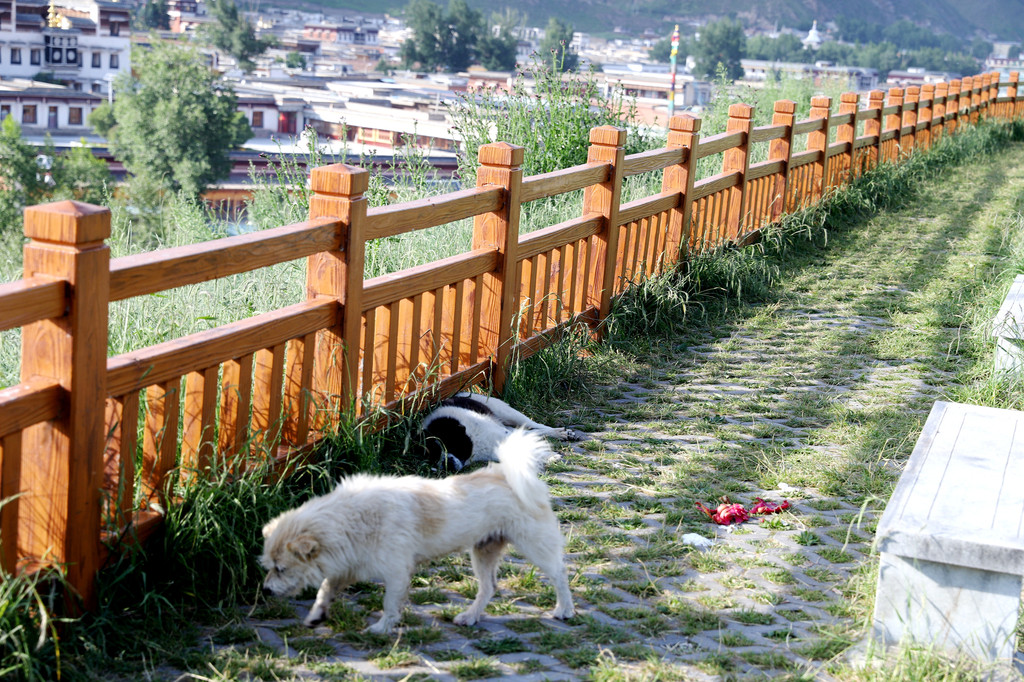 在山坡上拍照和休息逗留了一个多小时,然后又下到旁边小山坡上专门修建的一个观景平台,这里也可以看寺院群的全景,但视野多少有些受限。倒是观景台前面的栏杆被阳光照射留在草地上的影子,让人感到很好玩,在栏杆边躺着两只懒洋洋的小狗,一只后来站起来走动着,东张西望着,好像在想:这个人在干什么?让人感到有点情趣。