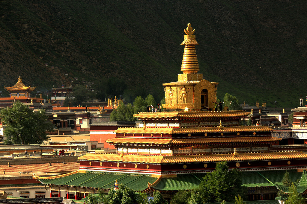 在拉卜楞寺院群大致转了一圈以后,就前往寺院对面的山上拍摄拉卜楞寺的全景。随着登山的高度不同,看到的全景也各有区别,但最醒目的还是贡唐宝塔和后面的几座金碧辉煌的寺院。