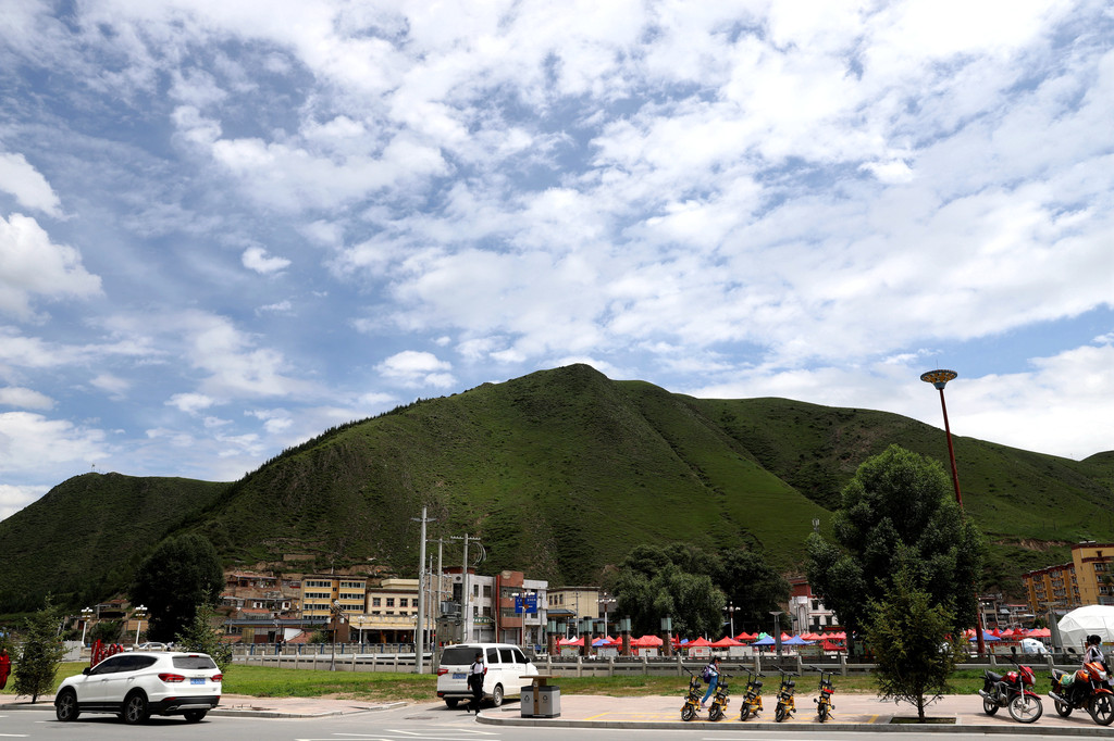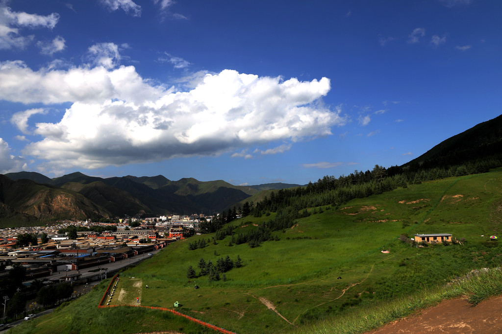 拉卜楞寺周边的青山也很美,在蓝天白云的映衬下,显得清新素雅,间或有一些游人行走或游玩其间,更显得富有诗意。