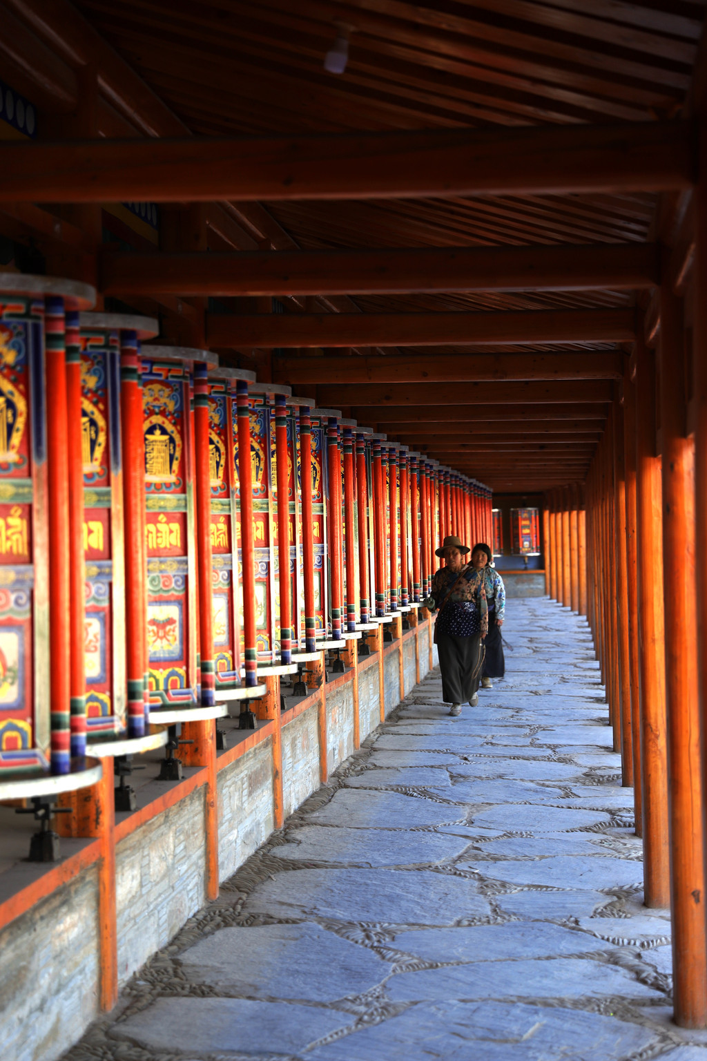 经幡和转经筒,是藏传佛教的典型标志。特别是拉卜楞寺的转经长廊,更是举世罕见。据说转寺一圈有4公里,随时都可以看到行色匆匆的信徒手拿佛珠,口里念念有词地转动着经筒匆匆而行。