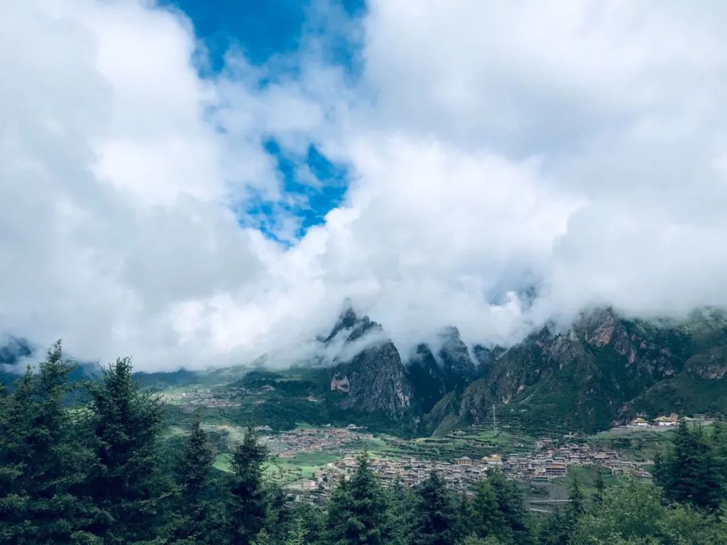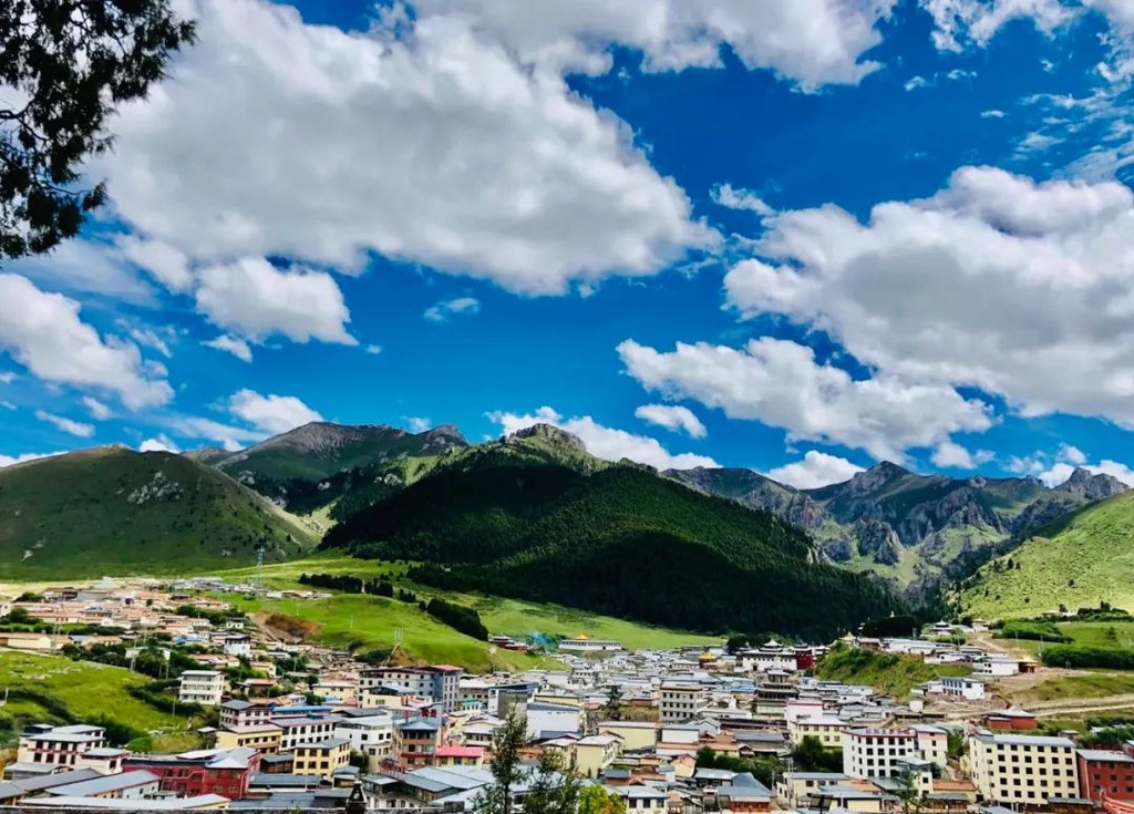 从林中俯瞰郎木镇,景色极为宜人。上有蓝天,中有远峰层叠,下是疏朗小镇。