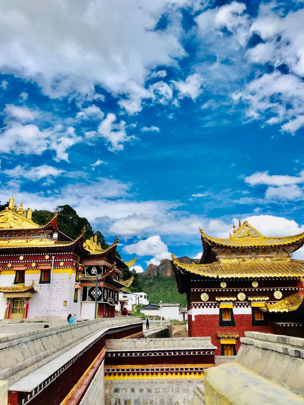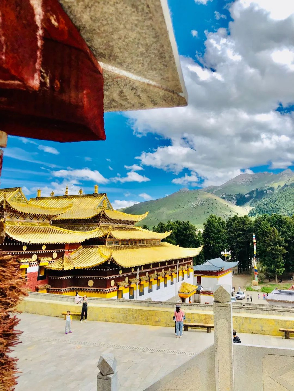 老远就瞧见了。实在是金光闪闪,无法忽视。寺庙建在山坡上,入口处有一座大白塔,后面就是连片的佛殿。每座大殿都是鎏金的屋顶,明艳的外墙。鲜艳的红色木头,明艳的或黄色或白的寺墙,还有喇嘛和游客穿梭其中,处处露着繁华,却不过分俗闹。虽是端午假期,游客并不算很多,可以细细游览,拍美美的照片。