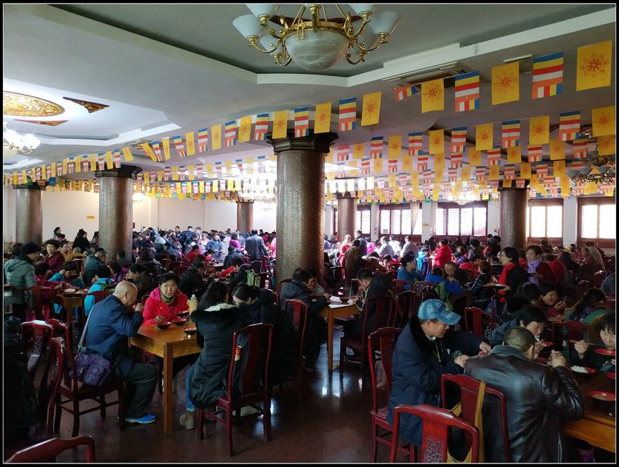 一直等到10:40左右,看到一队刚用完午餐的和尚由餐厅里鱼贯走出来,把持才放我们购票入内。与早上不同,餐厅里人声熙攘,等到我们进去的时候几乎坐满了,午斋增加了水果(桔子)和糖块以及小包装的花生大枣,可以任意取用。