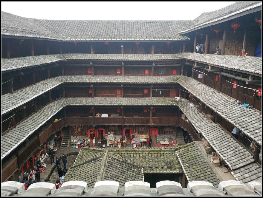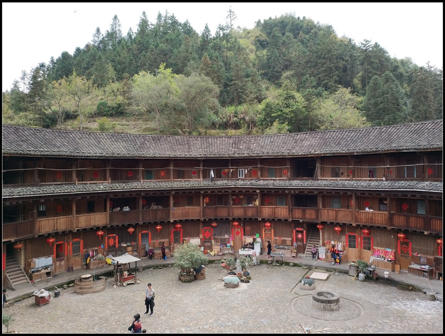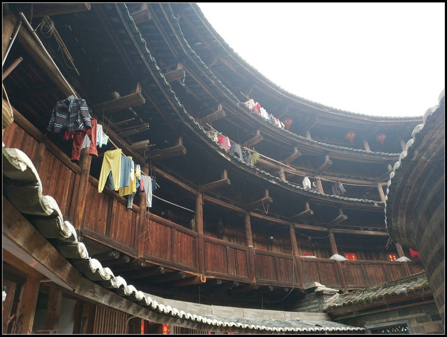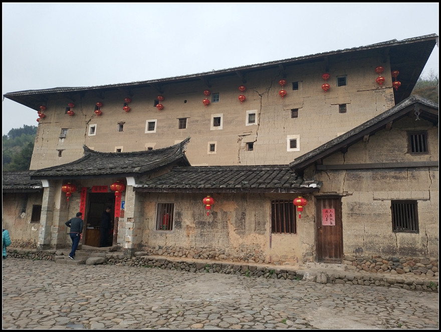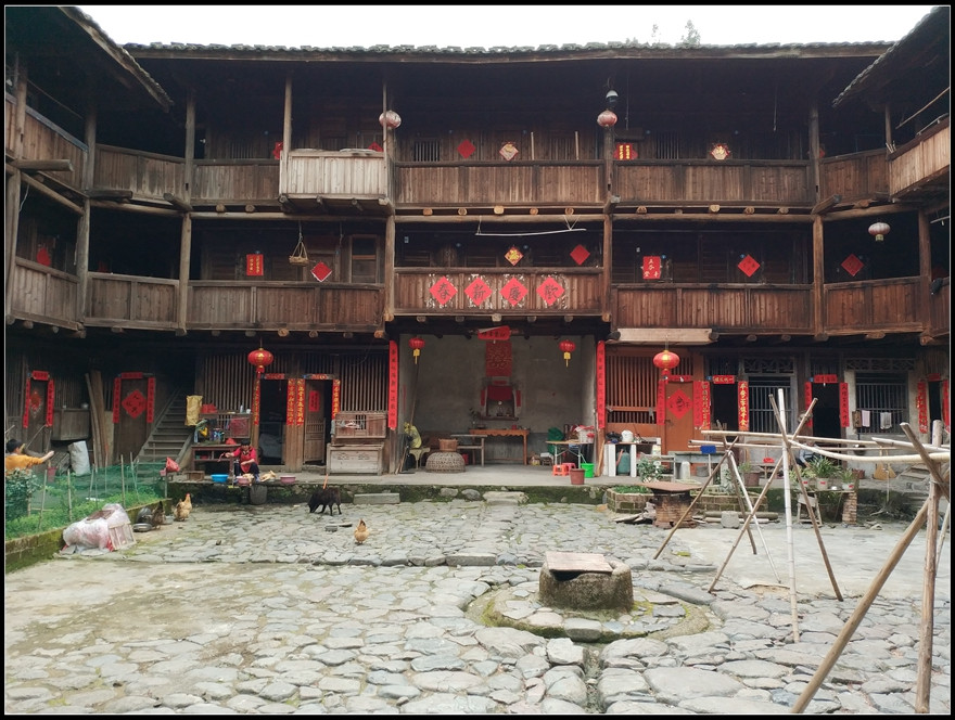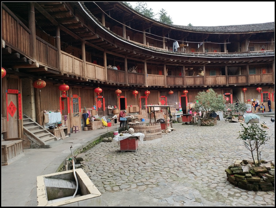 沿着导游的指引,到每栋具有代表性的土楼中参观,居住在土楼中的当地村民非常热情,见面或点头或招手打招呼,村中很多地方都有鞭炮的碎屑,空气中飘荡着鞭炮的味道,家家户户杀鸡宰鸭,像过节一样。