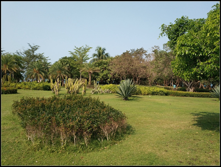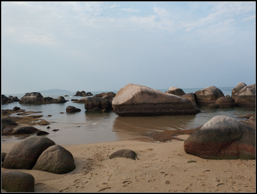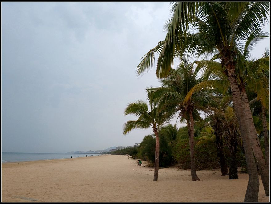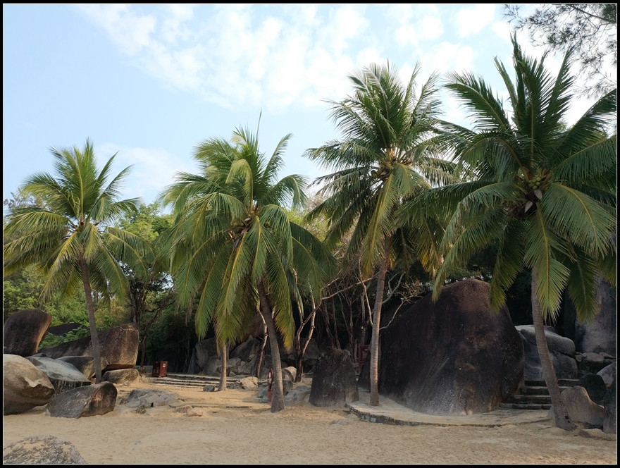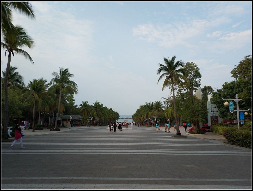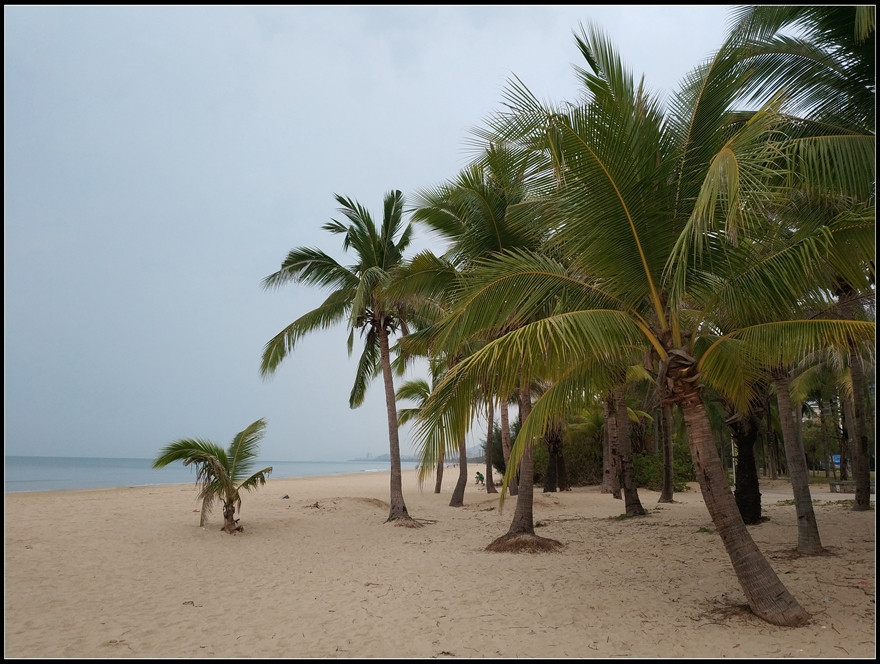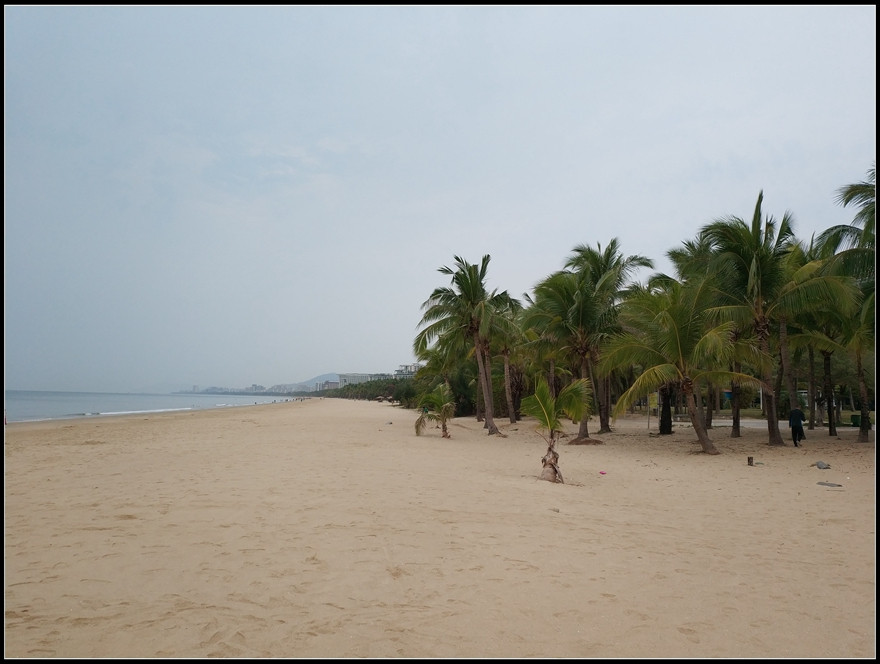 迈过一条马路,就是布满椰林的海边了,长长的林带绵延不绝望不到尽头,一直延伸到远处的天涯湾。晨练的人犹如天空中依稀可辨寥若可见的星星,三三两两散布在海边,做着舒活筋络的各种动作,也有人一边聆听着海潮起落的声音,一边慢跑在细腻如面的海滩上。远处的玳瑁岛在海雾中隐约浮现,缥缈而又神秘。