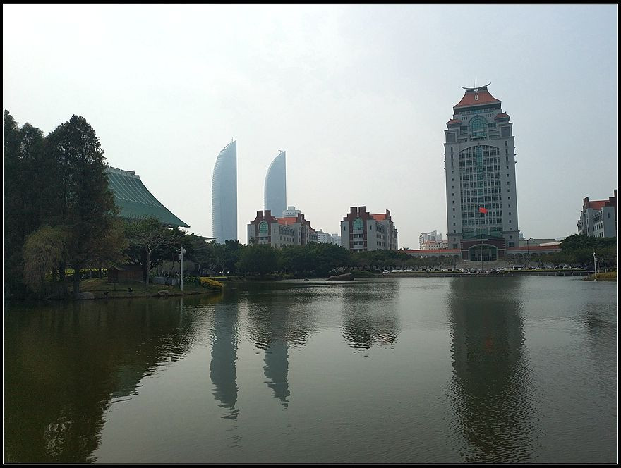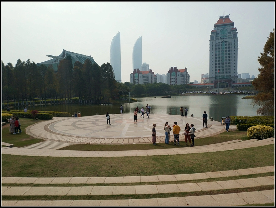 同学把我们一行六人领进校园。厦门大学由爱国华侨陈嘉庚于1921年创建,是中国教育史上第一所侨办大学。思明校区风景秀丽,绿植葱郁,由于季节的原因四季常绿,芙蓉湖畔景色宜人。在芙蓉湖旁的一家咖啡厅点了现磨的拿铁和巴西咖啡来喝。
