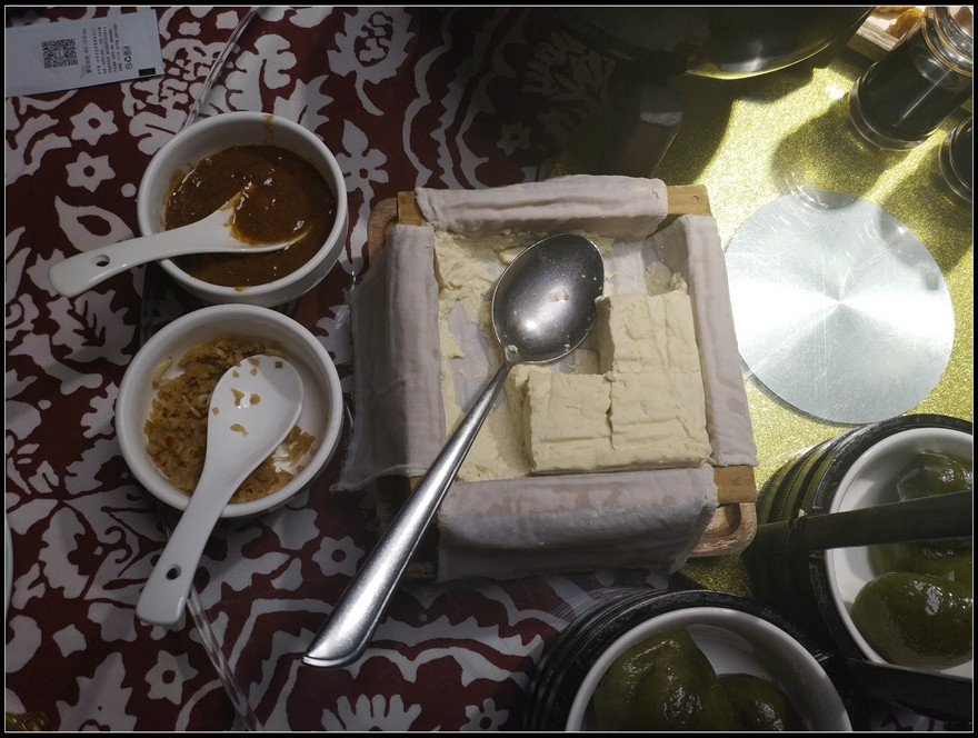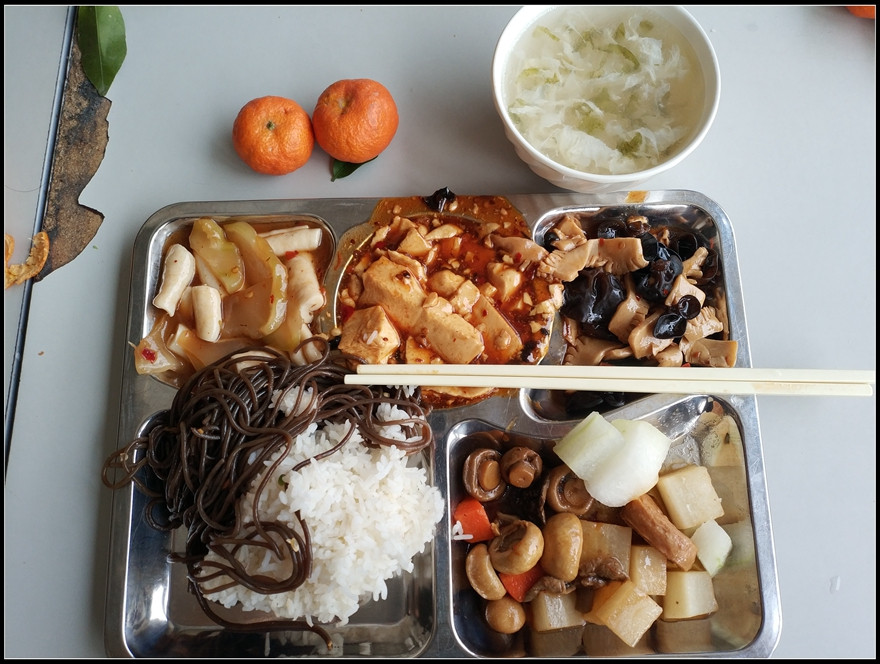 中午在景区内“禅悦苑”餐厅吃素斋。素斋是自助餐,每人30元标准,品种花样很多,主要食材为豆腐、木耳、萝卜、菌菇、米粉等,有免费水果可以取用。