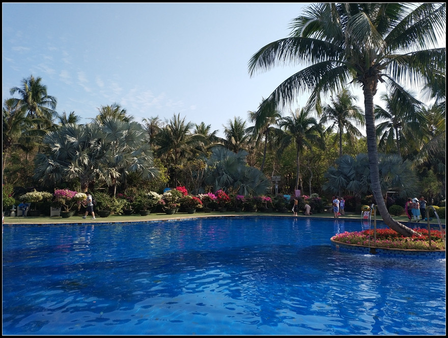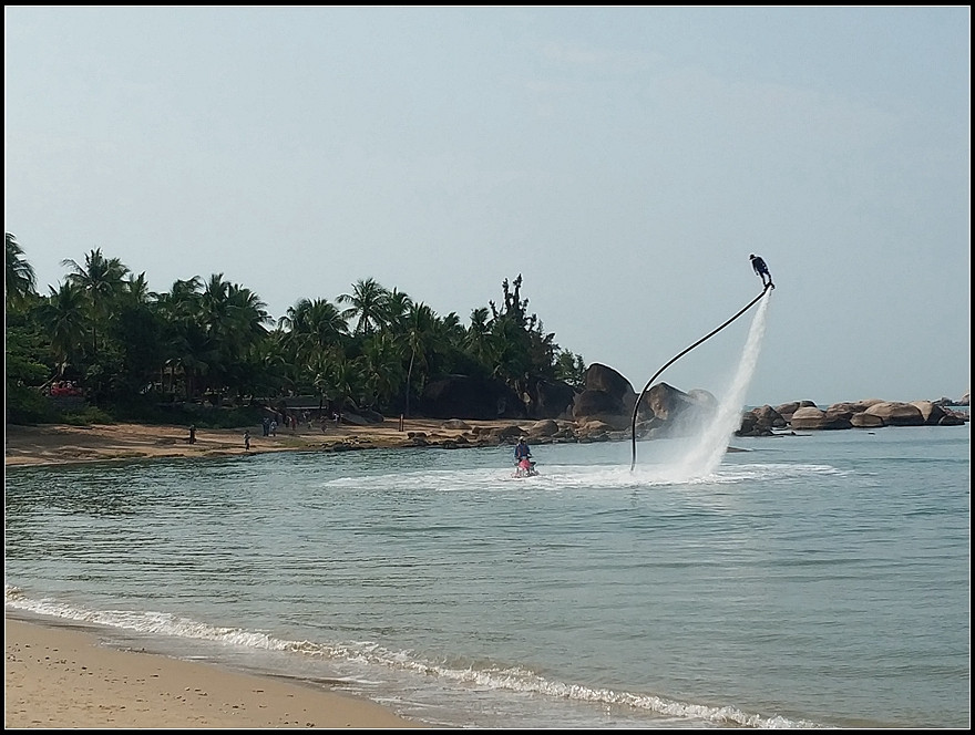 五个景点分别是许愿亭、情人谷、情人岛、《私人订制》和妈祖庙。前两个水分较大,后三个景点,情人岛海清水碧,清澈见底,欣赏一下海岛风情,感觉不错,妈祖庙我们因时间太晚没有进去,但珊瑚酒店附近的《私人定制》拍摄地还是值得一游,什么空中飞人、激流勇进、直升机环岛,游玩的项目特别多,环境优美,风光秀丽,深蓝和浅蓝色的海水交替呈现,大海边、椰林下、泳池旁,有数不清的新婚情侣在卿卿我我摆拍婚纱照。