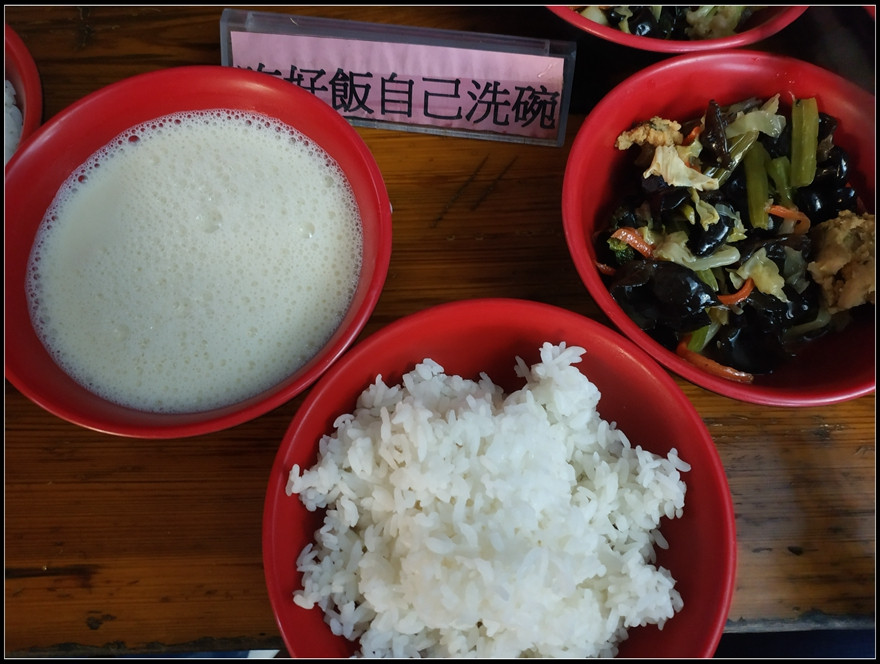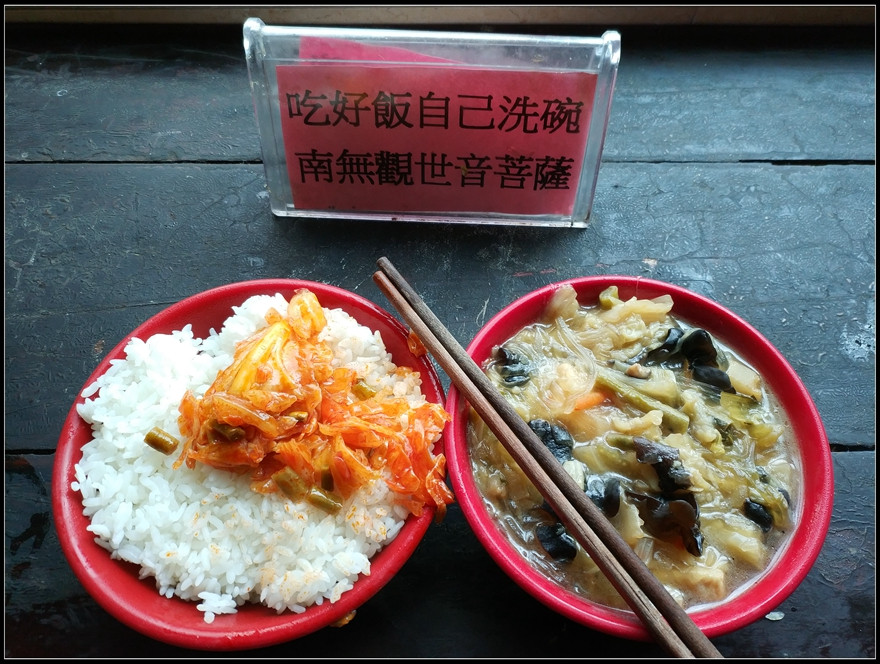 斋饭只有米饭、豆浆、豆渣和白菜木耳四样,每样前都有一个和尚在把持分配,赶紧一人取了两个里红外黑的饭钵,一个盛菜,一个盛饭,菜里让师父稍微加了点豆渣,豆渣很香,师父说吃完再添加,可能怕太腻吃不完浪费。盛完饭菜才发现还有豆浆,就又去取了一个饭钵让师父加了一碗豆浆。很快豆浆分完了,再晚到的香客就没有了豆浆供应。所以如果在6:10之后赶到的话,也许能够吃上斋饭,但不能保证能够吃到斋饭的所有种类。