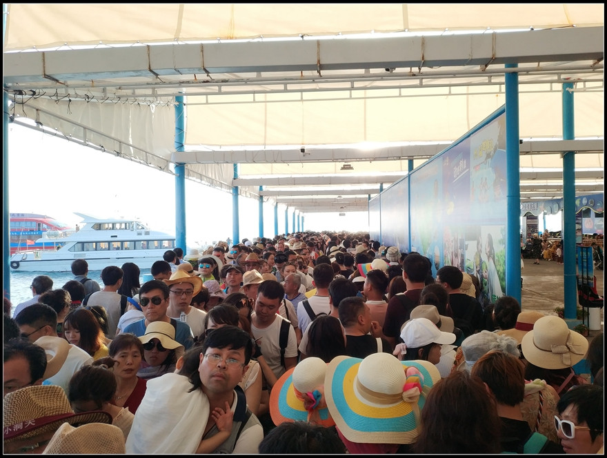 到码头一看,再次崩溃,排队出岛的人乌压压簇拥在一起,保守估计大约有一千多人,我们丝毫不敢耽搁,赶紧排了上去,傻子一样沿栏杆围成的蛇形走道缓慢前行,很快我们后面又排满了出岛的游客,游客越来越多,最后聚集了大约两三千人的样子,就这样转来转去,来回折腾,大约排了1个多小时,才登上出岛渡轮。