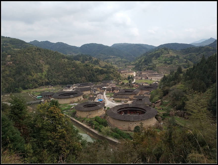 下午13:30到达河坑土楼,在小罗带领下先来到后山一个高处,在这里俯瞰整个土楼群全貌,可以欣赏到由七栋圆形土楼和七栋方形土楼组成的大小“北斗七星”壮丽景观。