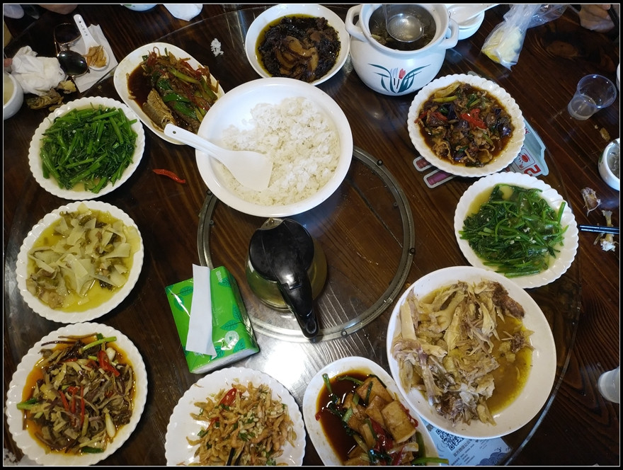 中午在云水谣用餐,小罗带领我们来到一家整个云水谣古镇唯一一家被网络评分5分的餐馆,吃的是具有当地特色的客家菜:高山果蔬、农家鸡鸭、野生溪水鱼,非常可口好吃,用完午餐,感觉餐间免费供应的铁观音茶喝起来有一种特别的清香,就询问服务员茶的来处,服务员告诉是老板娘亲手炒制的。让她找来老板娘,取出更好的茶叶,不用尝,几人买了一些,结果回来后仔细品味,乃铁观音中的上品,正像老板娘介绍的那样,茶中带有一股浓浓的奶香,后悔买少了。