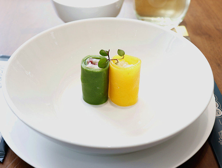 点击添加图片描述(最多60个字)编辑吸睛的两色两味卷,赏心悦目,芒果卷包裹的西米露香糯可口,黄橙贴心,艾叶包裹着莲雾和银耳,翠绿可人,静卧在碗中,鲜艳娇滴,清爽怡人。黑鸡枞炒虾滑藕贴也颇具有田园风味的,带来健康的绿色和满满的夏意。