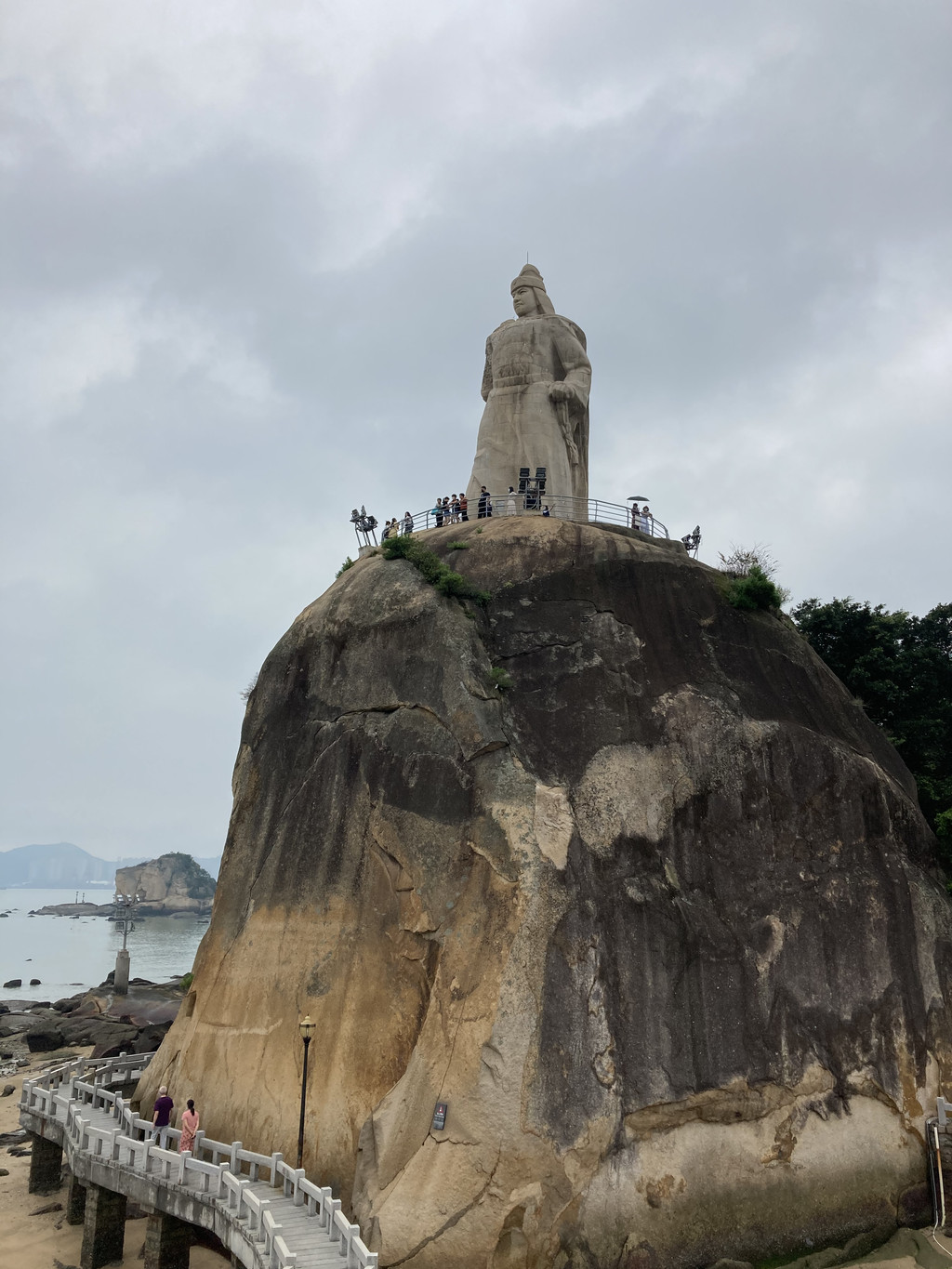 从胡里山炮台往下看是白城沙滩和演武大桥,天空飘着濛濛的细雨,能见度不高