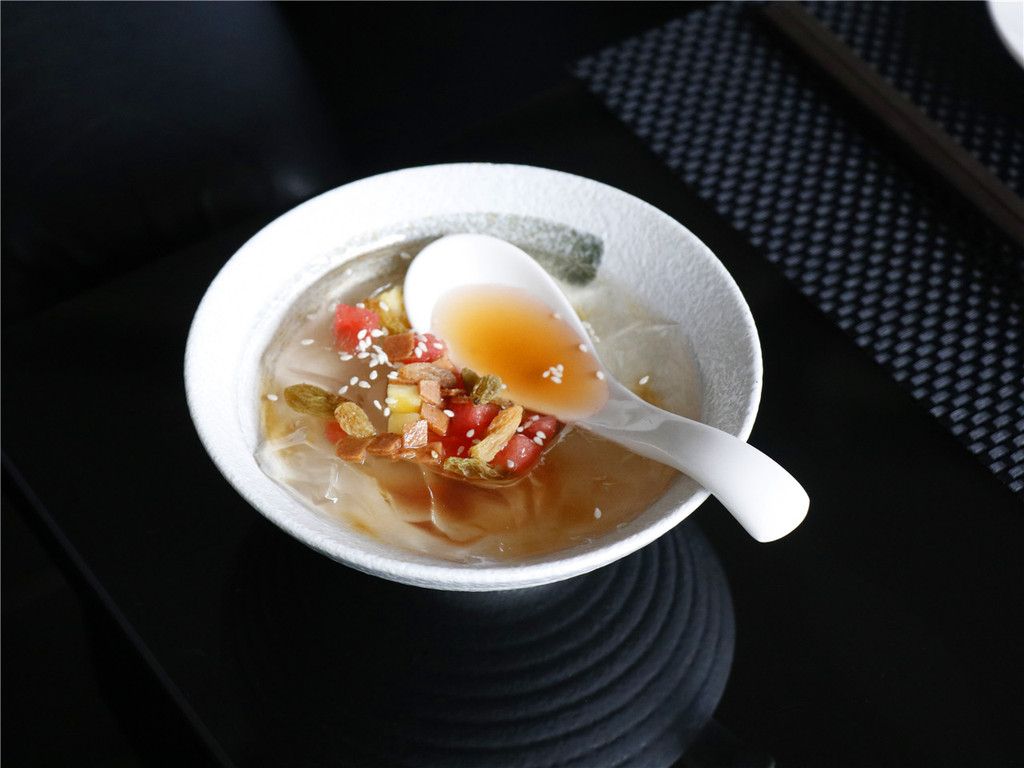似乎四川冰粉俨然成为川菜的甜品,地道的红糖水,冰镇的凉粉,还有葡萄干、西瓜和菠萝丁,新鲜甜蜜。其实,在我看来,除了是甜品,更是一个迅速解除口中辣味,让胃马上舒爽起来的好东西。