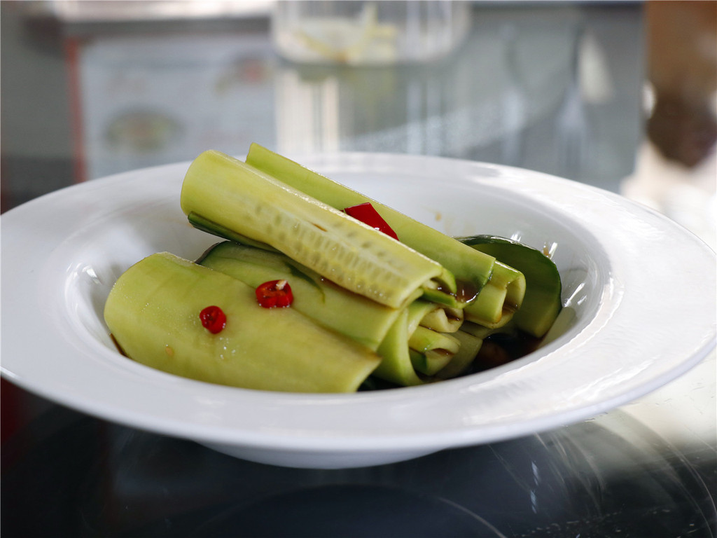 不忘本色,乐于创新,无论是造型或者食材的选择和结合有新的突破,都说餐前来个清爽的很合适,这里的爽口乳瓜,采用来自日本的小黄瓜,厨师刀工了得,干净利落滚片,再酱料腌制,红红的小米辣的点缀,将整个味道起到点睛作用——清爽之中的挑逗。