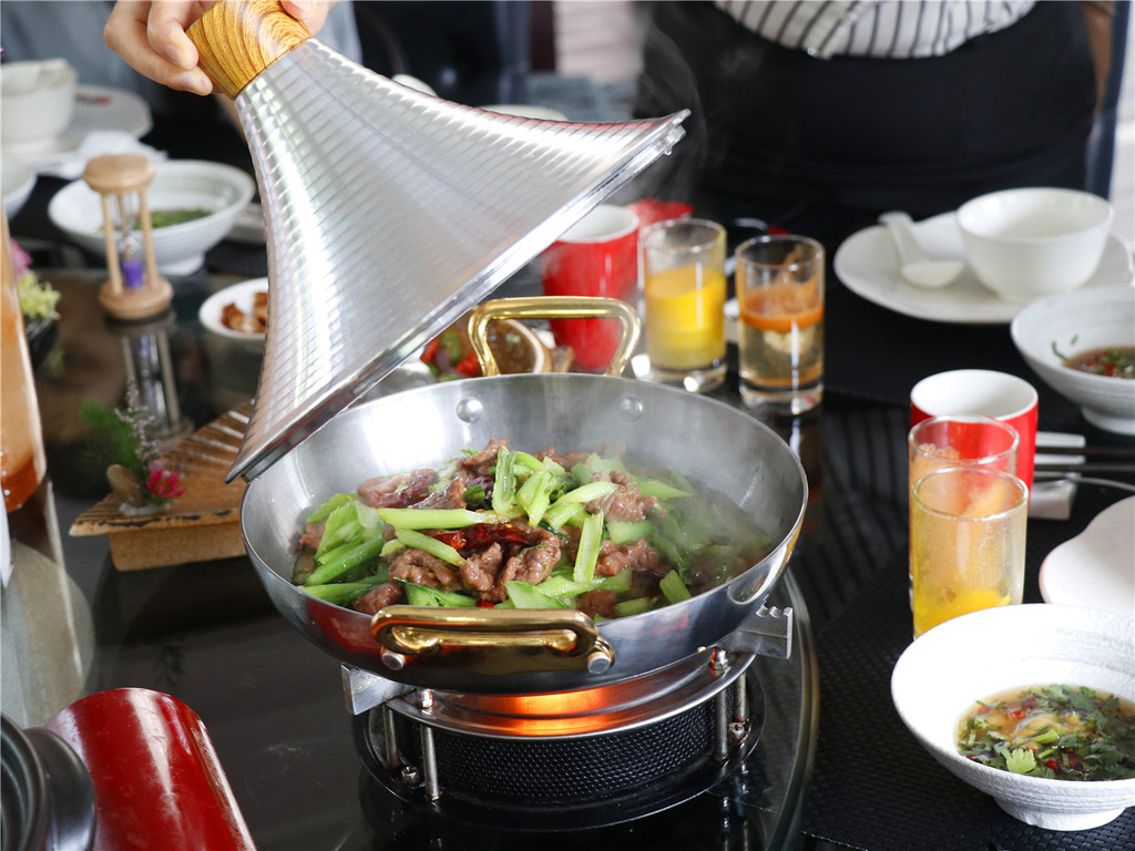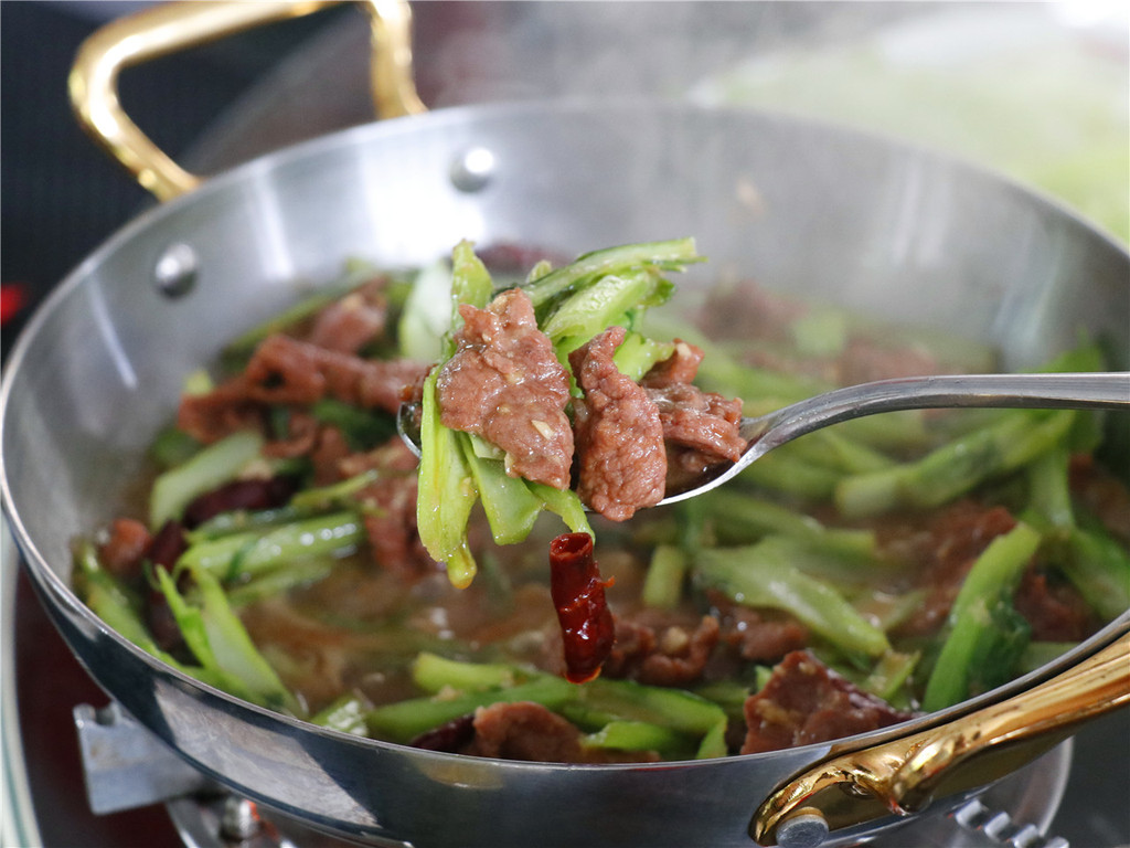 富有民族特色做法的是芥菜炒牛肉,牛肉顺滑,持续的加热使得味道越来越浓。