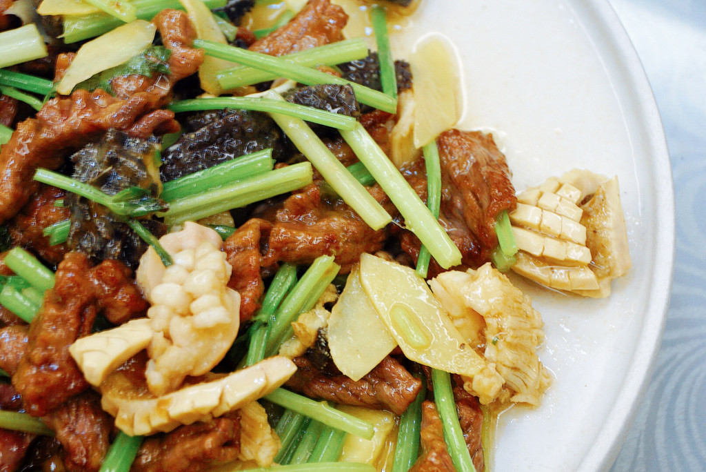 九门头:同样是客家菜必点的招牌之一,选取牛肚尖、牛百叶、牛胸脂、牛三肠、牛肝等等九个不同部位用旺火爆炒,厨师的厨艺一定相当了得,分秒拿捏的恰到好处,口感超级脆嫩镬气十足。