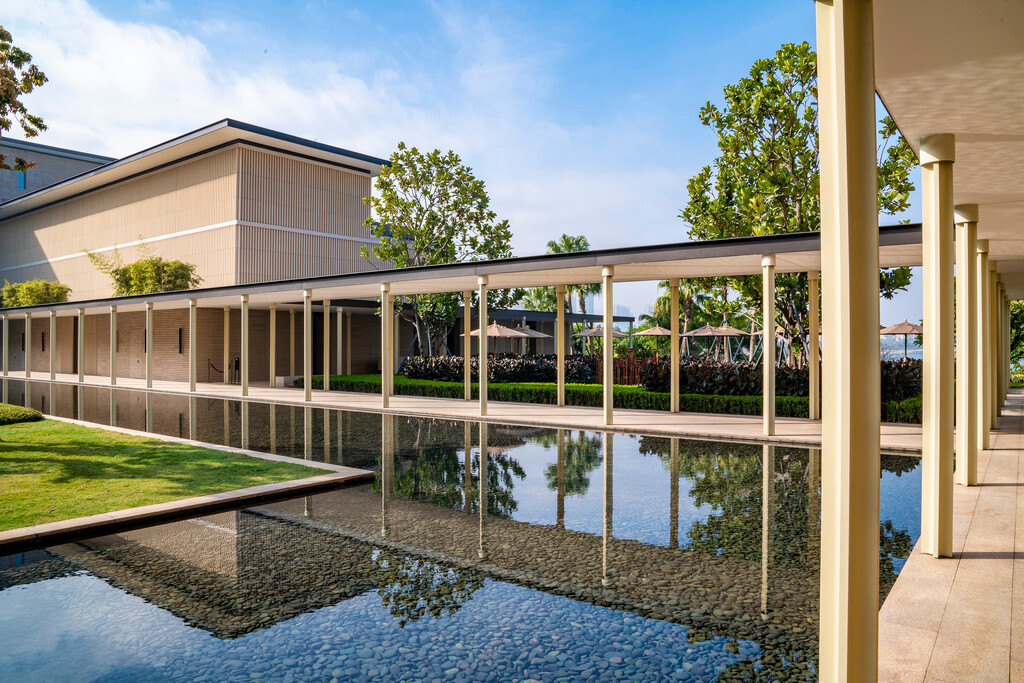 酒店的园林景观设计,无处不在的水是重要的角色,以水为媒介刚柔并济,连接着各个空间。立体规整的空间格局,结合优美的线条,超强的设计感,悄然的沉浸在这其中。