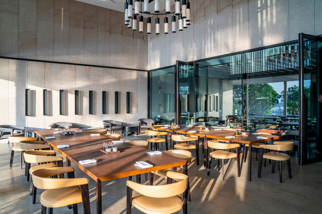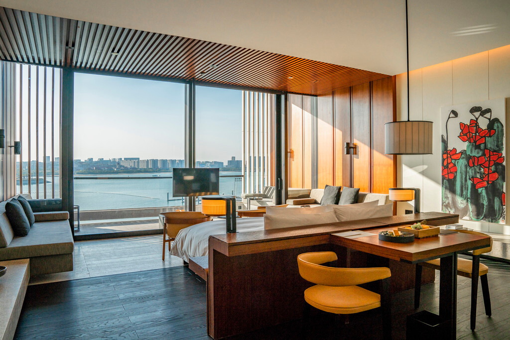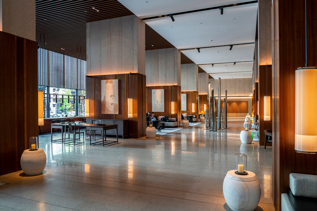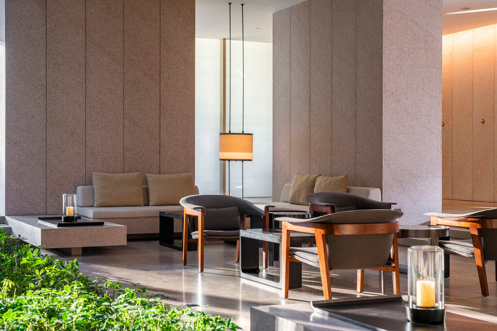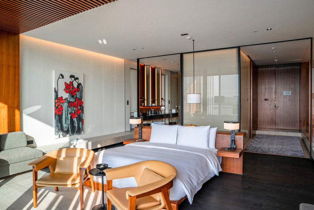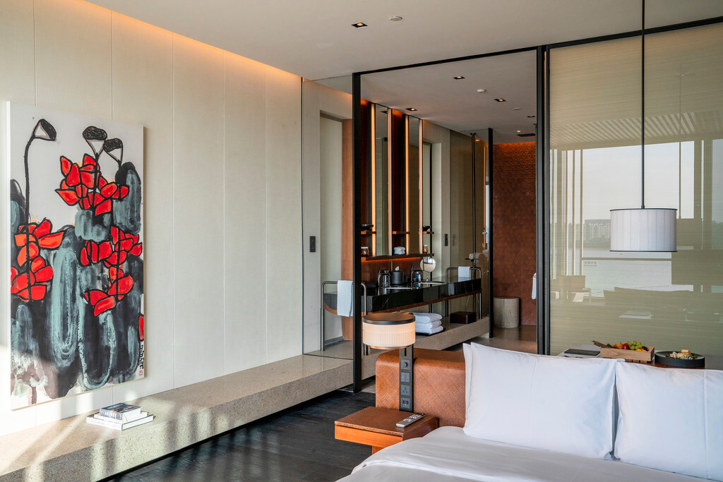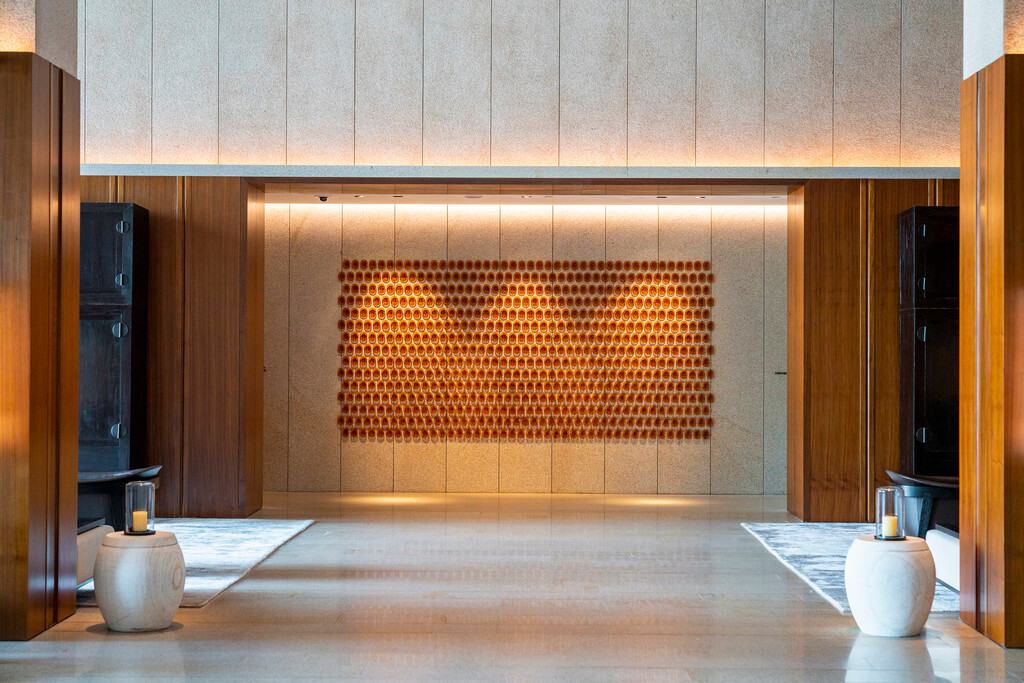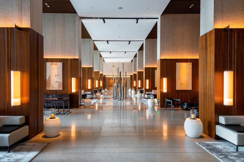 大堂区域宏伟大气,几分幽深的禅意境界,光影交错与当地石材质地完美契合,营造出柔和优雅的低调奢华氛围,酒店既饱含深厚文化底蕴,又彰显当地、去繁从简的设计理念。大堂的画作是出自著名艺术家卢甫圣先生之手的《二十个变奏》,一组以二十个人物造型为主题的系列作品,空间中都散发着独到的艺术气息,亦可共同品鉴欣赏。