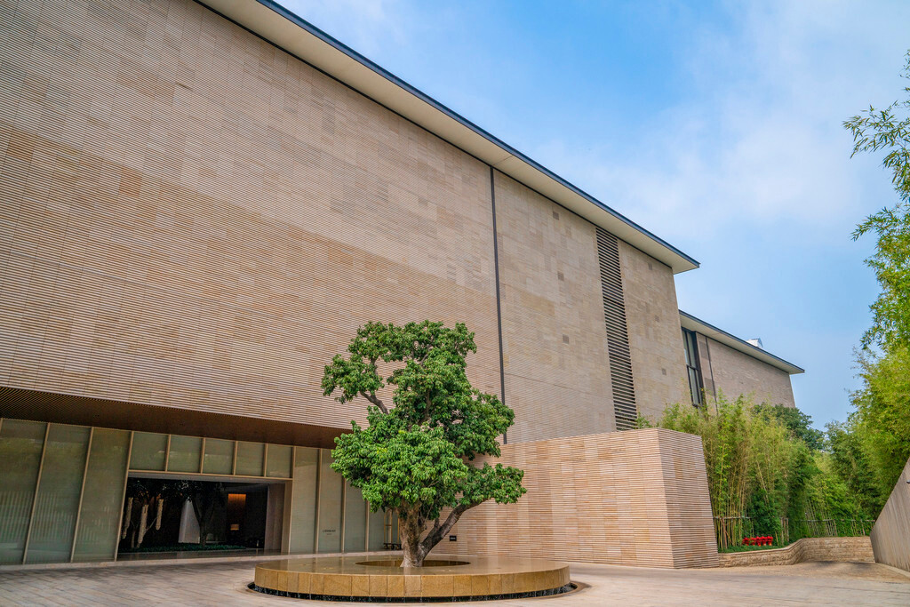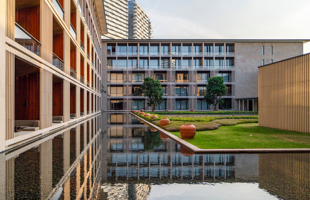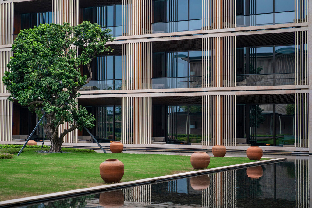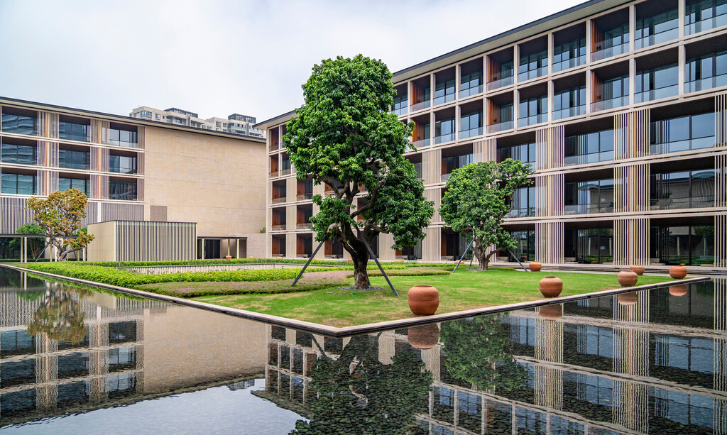 酒店选址十分优越,倾心打造出繁华都市中的一隅绿洲,从外马路通过一条隐秘的景观车道抵达酒店的中庭花园,车道两侧翠竹摇曳,用“曲径通幽处”来形容这里是再合适不过了。酒店的外观极其质朴,没有豪华酒店的高调彰显,却也不失内涵文化,建筑外墙致敬传统中式陶土的幕墙屏风。 中国 传统建筑的主流是规整式住宅,酒店以采取中轴对称方式布局,门前的荔枝树苍劲有型,充分展现着南 方城 市的独到特色,树下的水韵喷泉是巨型石盘造型,透露着对 中国 古典文化的传承。
