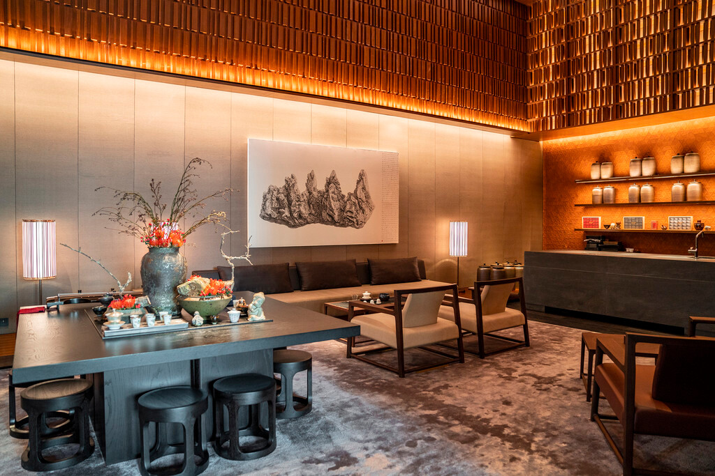 爱茶人士也可在大堂另一侧的书廊度过悠闲惬意的品茗时光。优雅气质的空间设计,柔和内敛的灯光氛围,多种组合的茶台设计,亦是商务洽谈、好友相聚的绝佳场所。