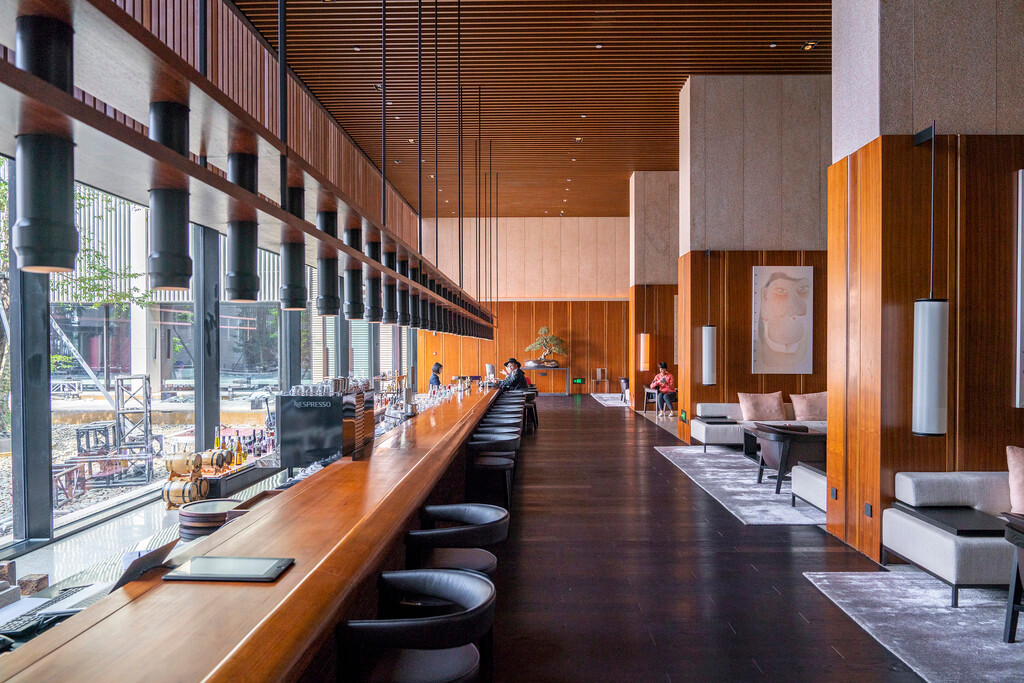 大堂吧的一侧,酒店前台与长吧设计为一体,具有非常标志性的特色。长吧将对称美学和东方元素相融合,根植本地美学情调,营造闽南式文化精髓,呈现前所未有的独特体验。