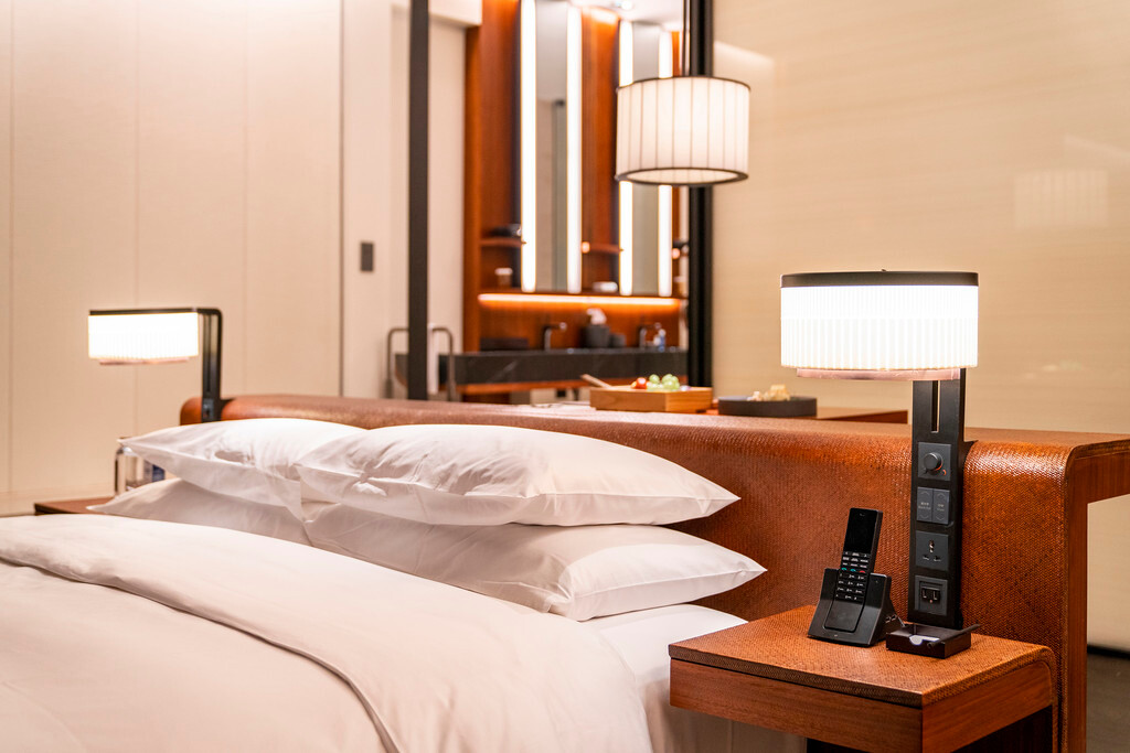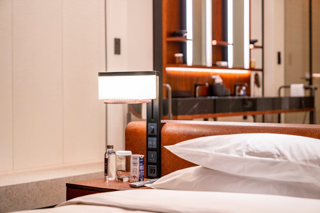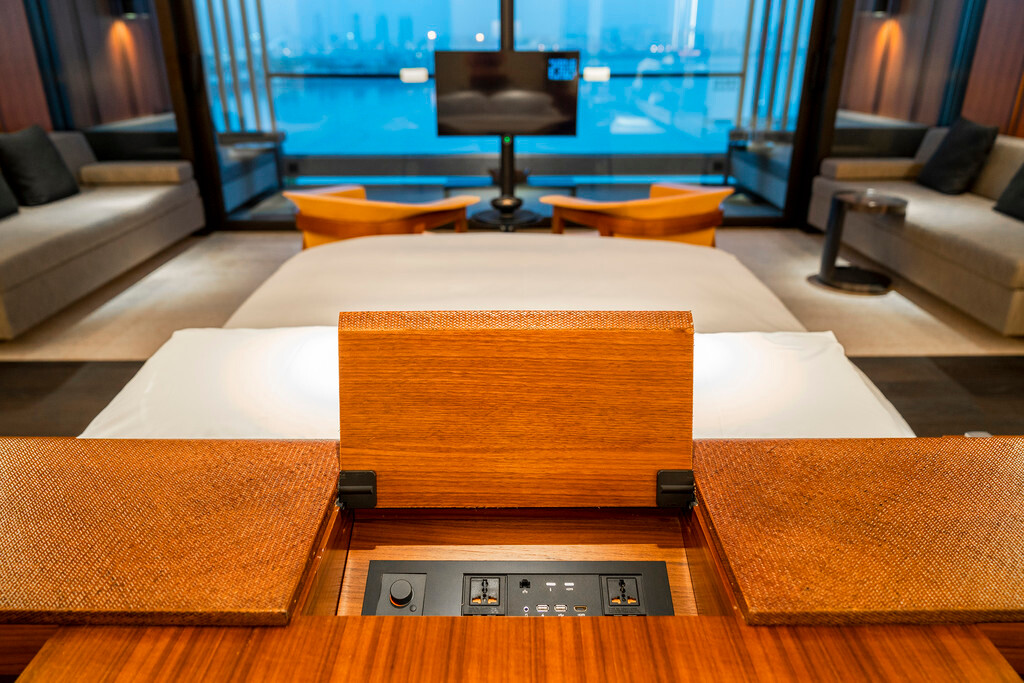 酒店对于硬件方面的追求不容小觑,采用的是Loewe 超高清电视,同时配备蓝牙流媒体功能,中控台就位于床头后面,隐藏式设计美观又实用,入住酒店亦可拥有极致的音乐享受。