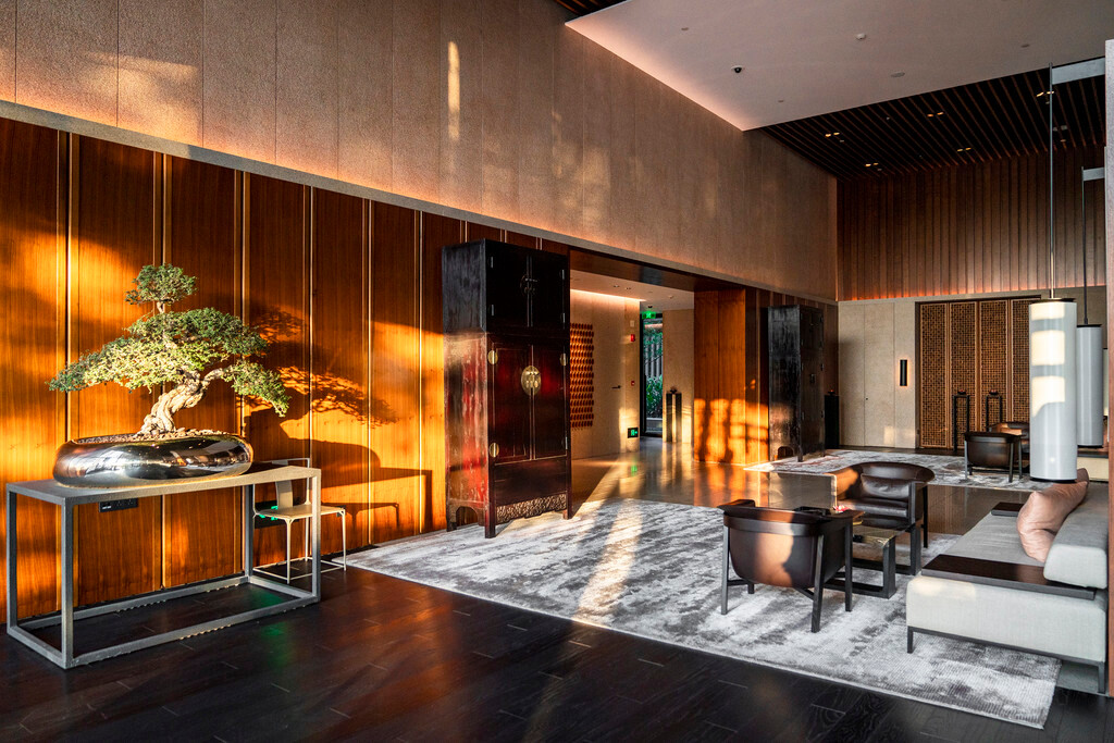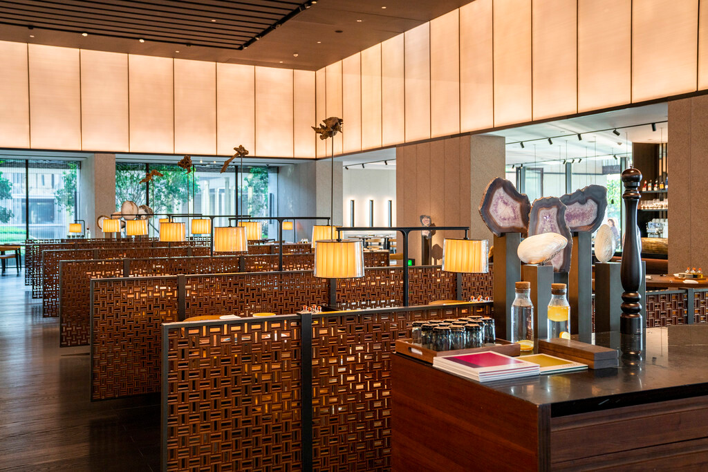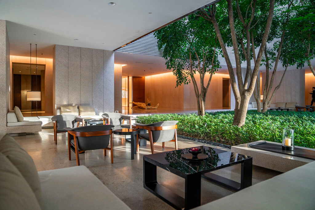 酒店入口处的后方并非传统格局的大堂空间,而是中式院落的天井设计,阳光自然的洒下,巧妙的利用了光影间的交互,木与石的四方园林景观设计,树影婆娑绿光涟漪,仿佛置身于自然的丛林之中,在这里休憩亦或是下午茶,那氛围真是极好的。