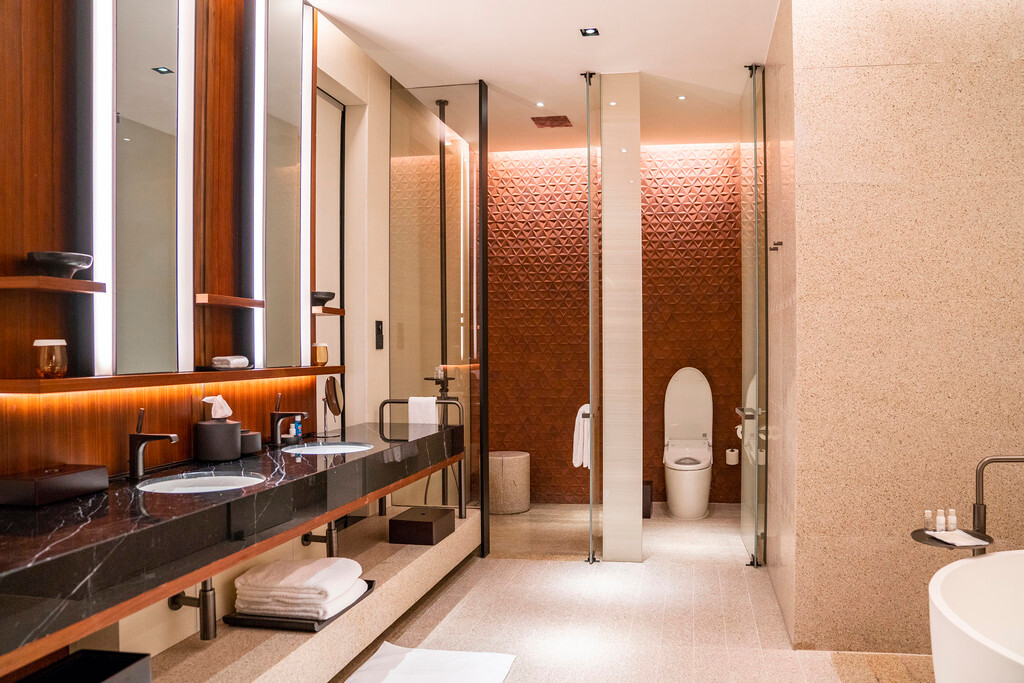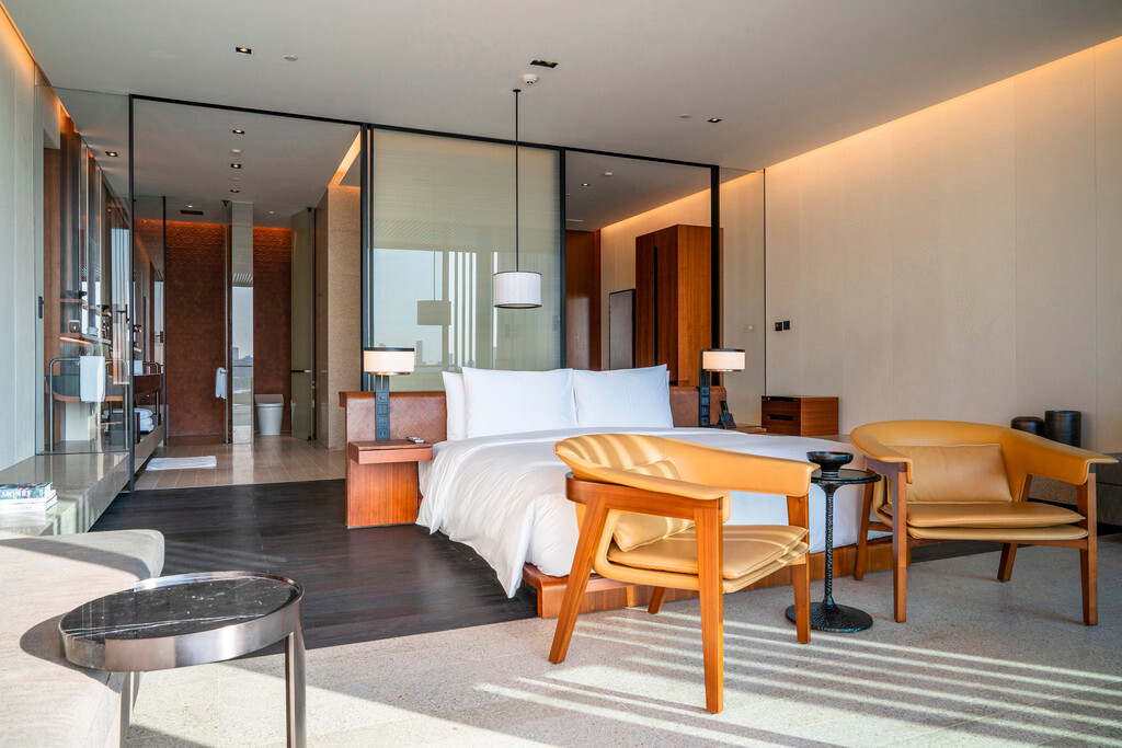 七十五平米的大空间开阔明亮,房间格局一目了然,划分出多个功能区域,整体呈现中式简约的现代风格,简约而不简单,无处不透露着大气奢华的配置。和酒店的公共区域一样,客房内也到处是锈石的主导空间,地板、台面、洗漱台均是大胆的应用。大规格的迷你吧、大规格的移拉推门,在硬件方面选材要求极高,对于工艺技术也是追求极致,一切只为给住客提供一个温馨舒适的家的空间。