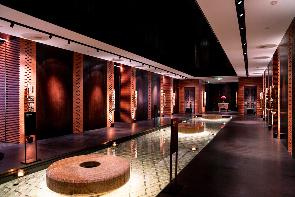 大堂吧中间位置的石雕作品,源于老板的艺术收藏,来自 泰国 的珍贵石材,高低错落间营造出光影的互动空间。大堂吧的末端连廊,晶莹剔透的背景墙泛着红光,那是闽南的地方特色,使用 泉州 出品的琉璃做为主要装饰材料,显现海上 丝绸之路 的文化延绵。琉璃的是龟粿的造型,这是闽南地区祭祀中最重要的贡品点心,闽南敬神、祝寿、节庆经常出现,寓意 长寿 、健康,经由此处可转入酒店的另一个空间。