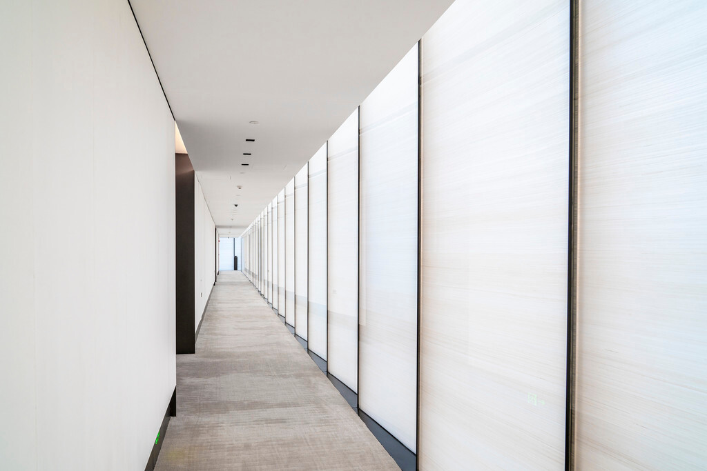 宾客走廊采用的是夹绢玻璃,将此应用于建筑外墙,在国内也是开创了先例,刚与柔的相互结合,增强了空间的包容性,同时天然采光也更趋于柔和。客房区域的私密性也是极佳,由专职人员带领至客房,不然自己的话还真挺难能找到,不同区域均配有大空间电梯,需配合刷卡使用,走廊地面铺设丝绒地毯,杜绝行走噪音的影响。