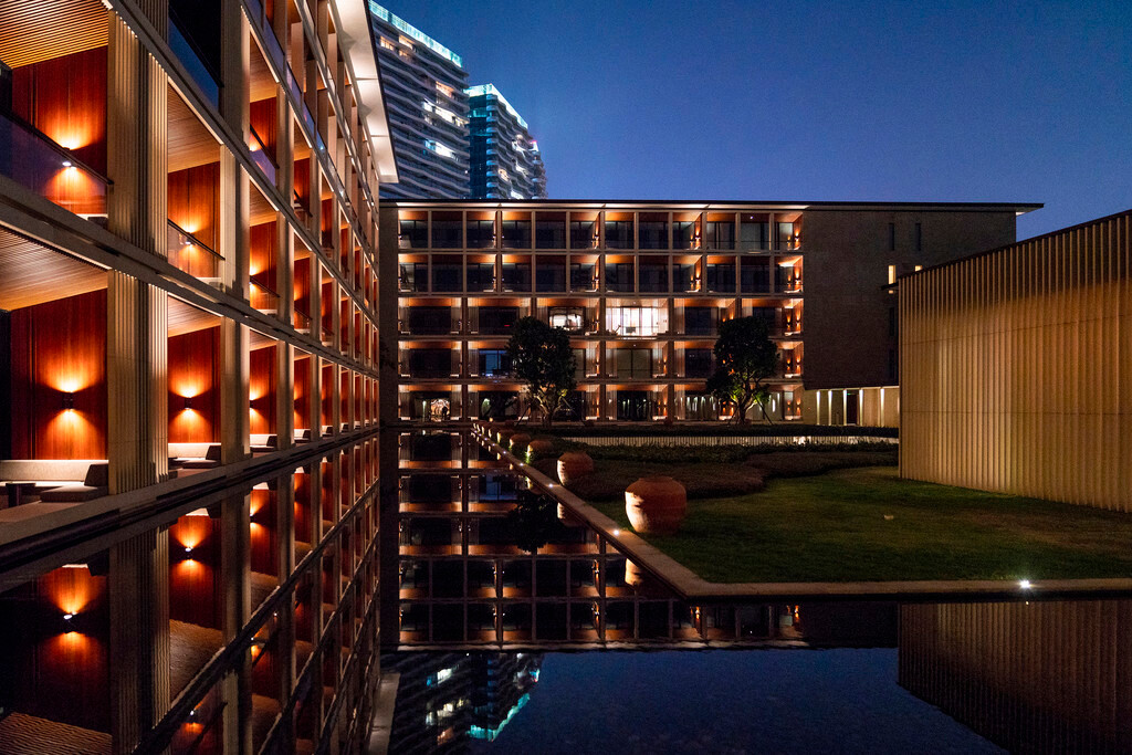 漫步在酒店的水景园林,各处无不透露着设计师精心打造的美学空间。建筑外墙是锈石拼接而成的栅栏纹理,优美的线条如同琴弦一般,石、水、光、影,相互交融,相互影响,营造出别致的景观氛围。