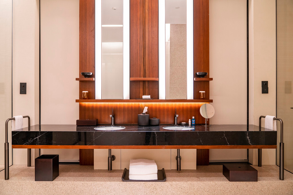 双人盥洗台搭配超大妆前镜,同时设有浴室放 大化 妆镜,满足住客的不同所需,洗漱用品采用的小众品牌CULTI,在浴室还能见到酒店少有配置的迷你漱口水,充分的为住客全方面考虑。