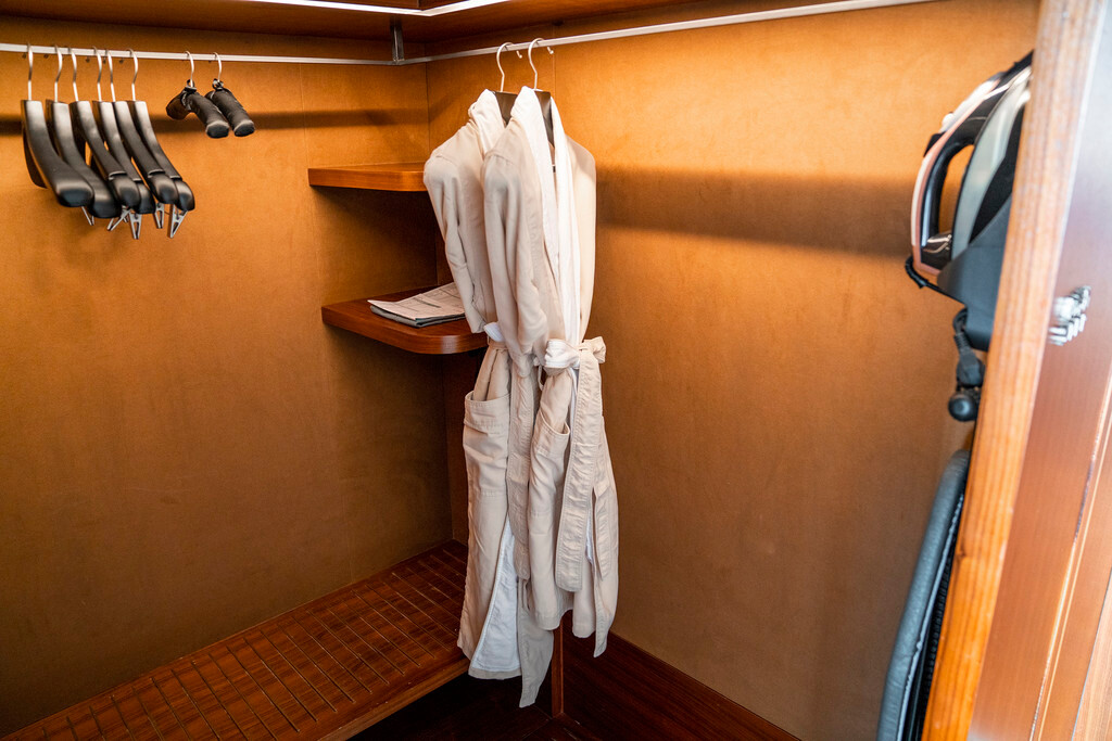 门口一侧是超大衣帽间,也可用来存放行李,外侧是超大更衣镜,搭配柔软舒适的两件浴袍,同时配备瑜伽垫和挂熨烫机,入住客人还可享受免费的每日熨烫服务,这点考虑非常的贴心。