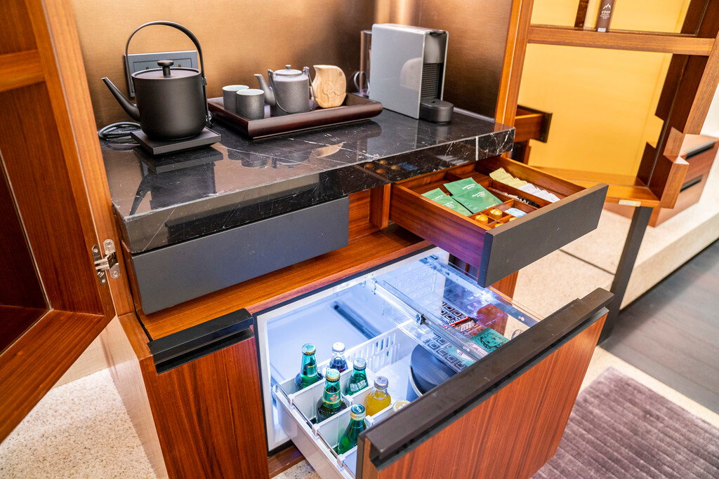 每日补充的迷你吧非常丰富,各色饮料搭配啤酒小食,饮用水更是充足提供,精致中式茶具,Nespresso 咖啡机、全套Asianera咖啡杯,住客均可随心使用,自由享受生活的乐趣。