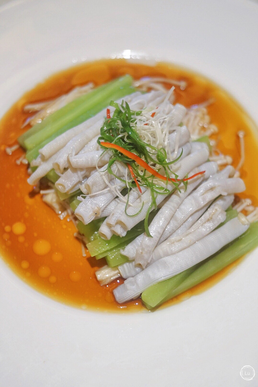 油淋沙虫油淋沙虫太过经典,十分考验厨师的“功夫”,绝对让你难忘,沙虫清洗得十分干净,汆汤的火候精准把握,和底部的莴笋丝两种脆爽在口里暗自较劲,只是简单的淋过酱油和香油,却是十足的可人,转眼就是光盘。