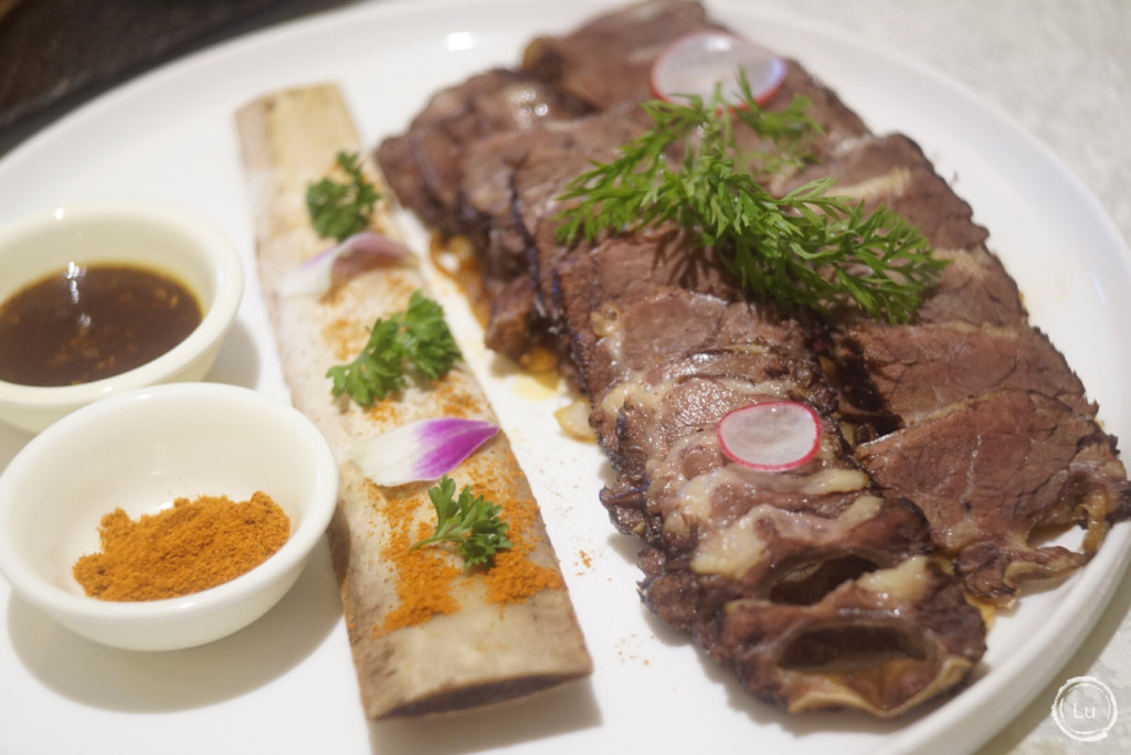 金牌牛肋骨 一整条的牛肋骨上桌十分霸气,卤制得香气十足,两种蘸酱给你带来两种不同的美味享受。