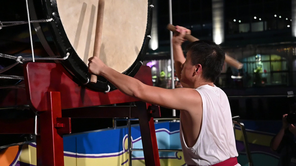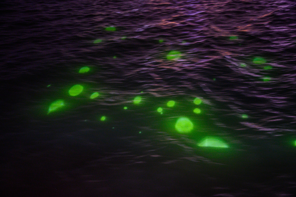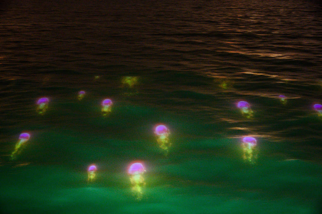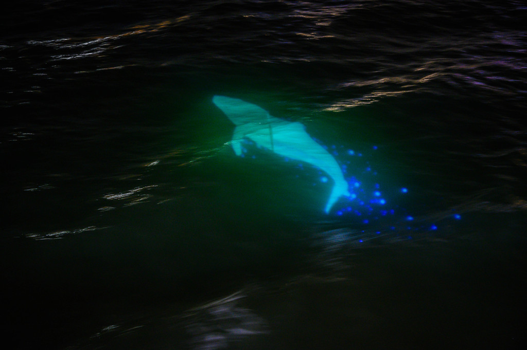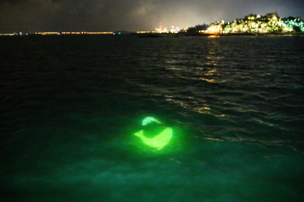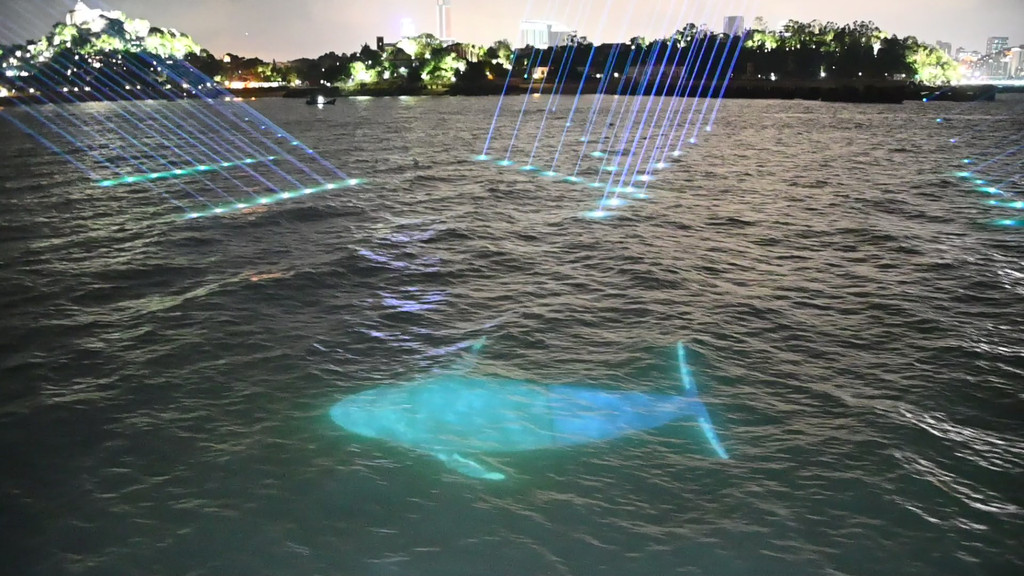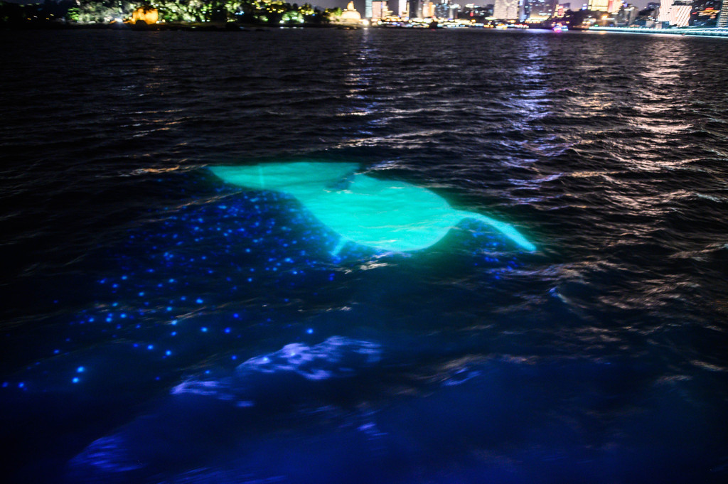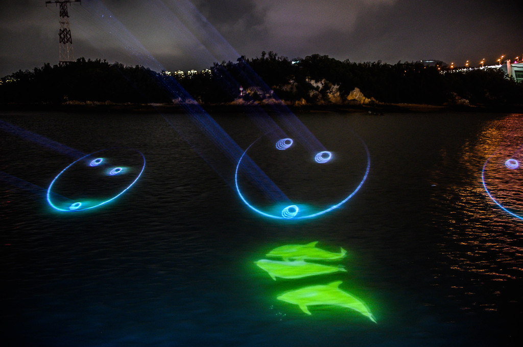 随着"环鼓夜游"的开场,小海豚、水母宝宝、魔鬼鱼等一系列海洋动物隆重登场,赶紧用相机记录下这精彩的一幕。