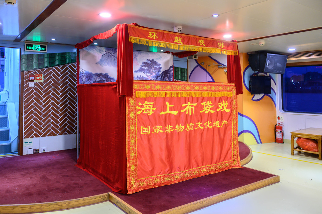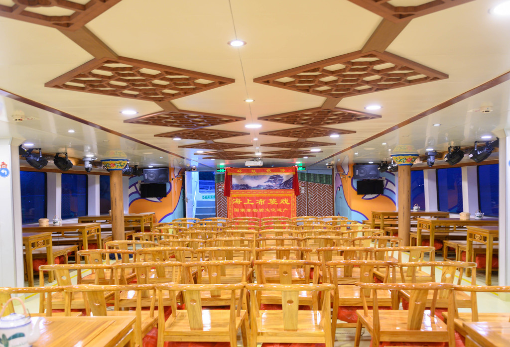我们到的早,提前登船一探究竟。进入船舱,一切都是中国特色,国潮引领时尚。船舱内的桌椅、装饰和非遗文化展品使得太古三号很特别。