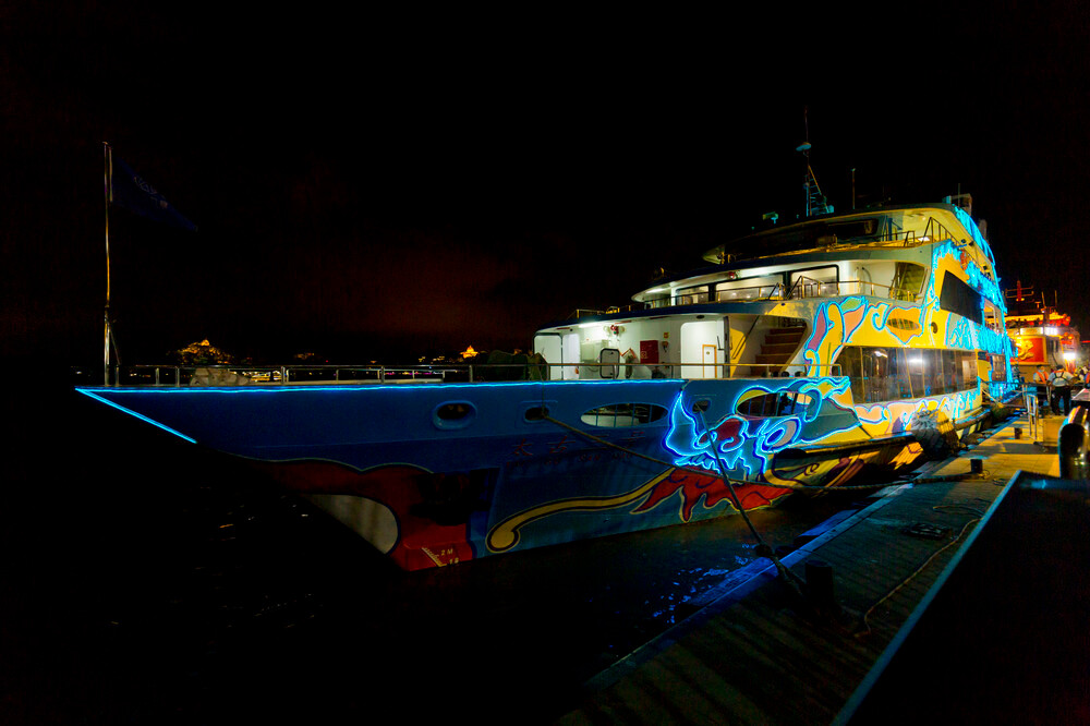 “太古三号”在外观彩绘中充分融合了古福船文化元素和闽南文化符号,展现出强烈的新国潮风格,再借助3D建模、AI生成、图像识别、视觉抓取等科技艺术手段,通过海面激光投影+激光灯光秀+闽南非遗文化表演的陆海空立体演绎方式,为消费者带来震撼的浸入式视觉享受和互动式艺术体验。