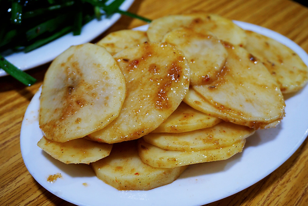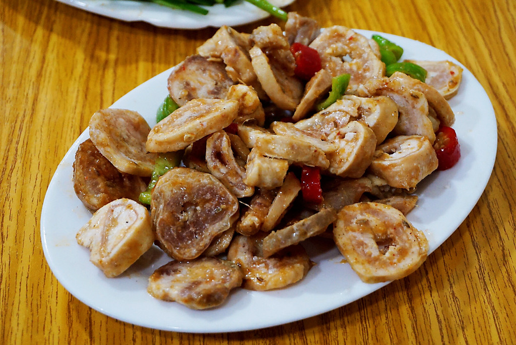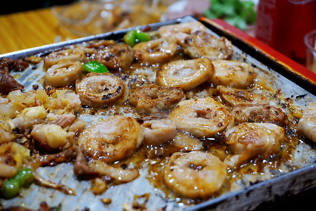 烤大肠,边上仙气十足的女生说,一道每次我都必点哦,你一定要尝尝!滋滋作响的氤氲中,大肠发出诱人的香气,烤到有点微焦的时候,夹一块乘着热呼劲吃,外脆里糯,非常带劲的说有满足感。