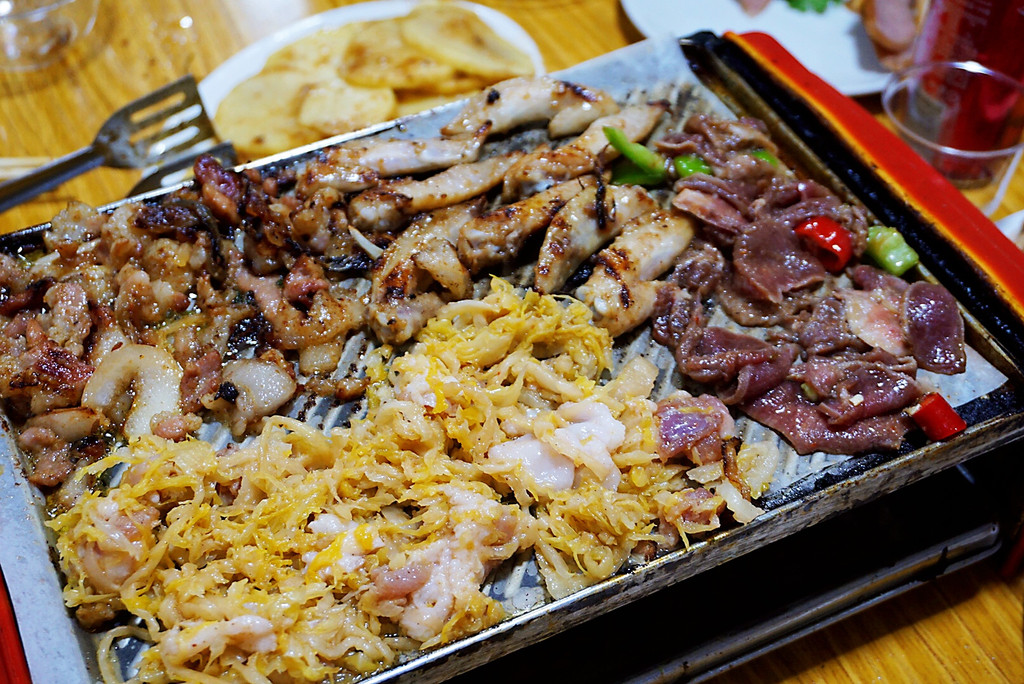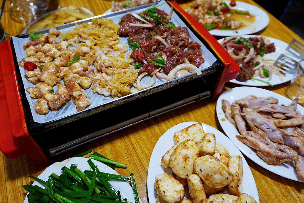说到厦门城市学院这一条烤肉街,每当夜幕降临,空气里就飘散着烤肉的香气。眼睛扫过蒋姐家烤肉店,门口的位置已坐满了人,乘着才开市马上占个喜欢的坐位,再晚一点估计就得等位了,用眼瞄一下临近的几桌,桌上各种拌牛肉、拌酸菜、土豆片什么的大盘小盘摆满桌了。听着烤炉上的五花三层发出滋滋的声音,烤出的肉汁在闪闪发亮,香气阵阵袭来,猛吞了口口水。