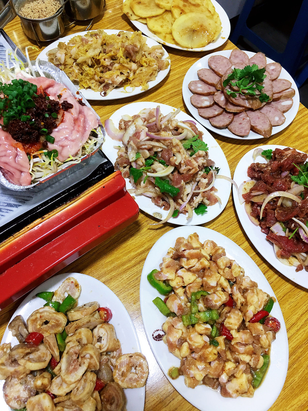 店里每天烧烤各不相同又都变着花样的好吃烤物,烤酸菜五花肉、烤牛肉、烤土豆、烤大肠、烤牛舌、烤猪脑...... 只有你想不到,没有烤不了。