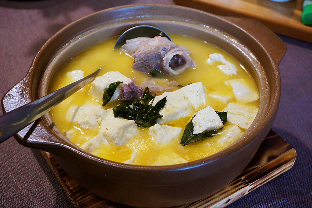 茶油咸骨老豆腐:山国饮艺茶宴每道菜都是用茶油入菜,老豆腐的味道是熟悉的儿时豆腐味,汤头甘甜浓郁让人久久回味。