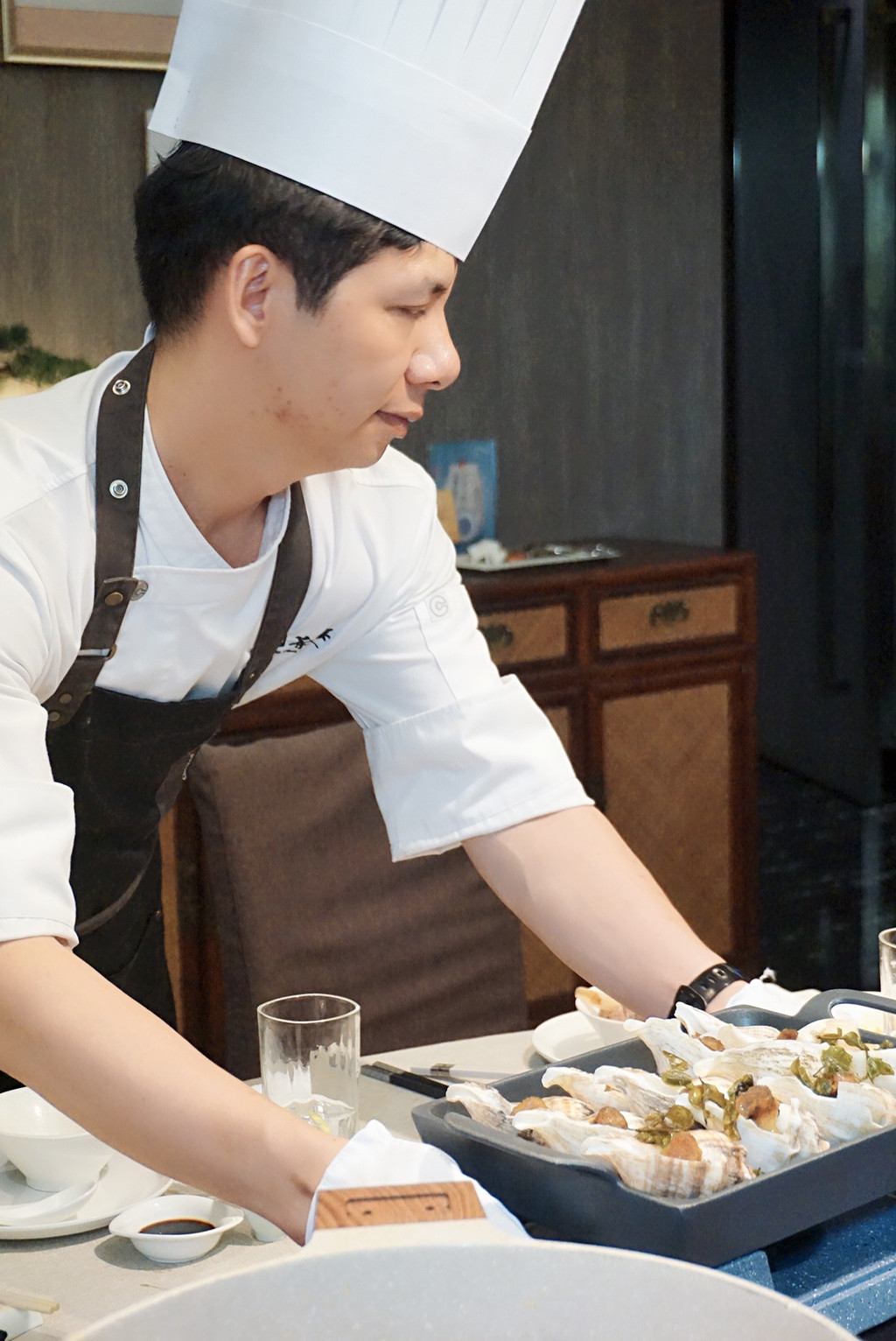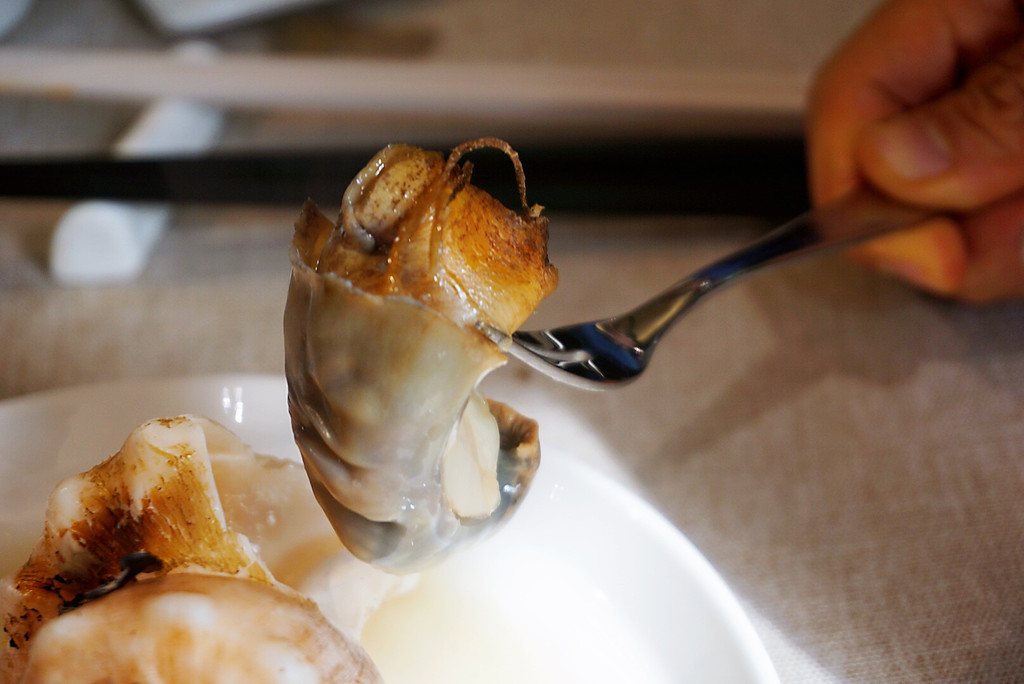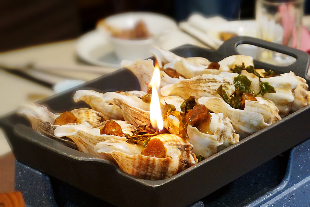 茶香陈皮烤香螺:香螺在端上桌前用火炙烤,陈皮和茶叶将香螺二次加热,茶香明显。拿起香螺,发现盘底埔着一层茶梗,有点心意。螺肉头部干香,尾部嫩滑,有淡淡的茶香和陈皮香萦绕口腔中。